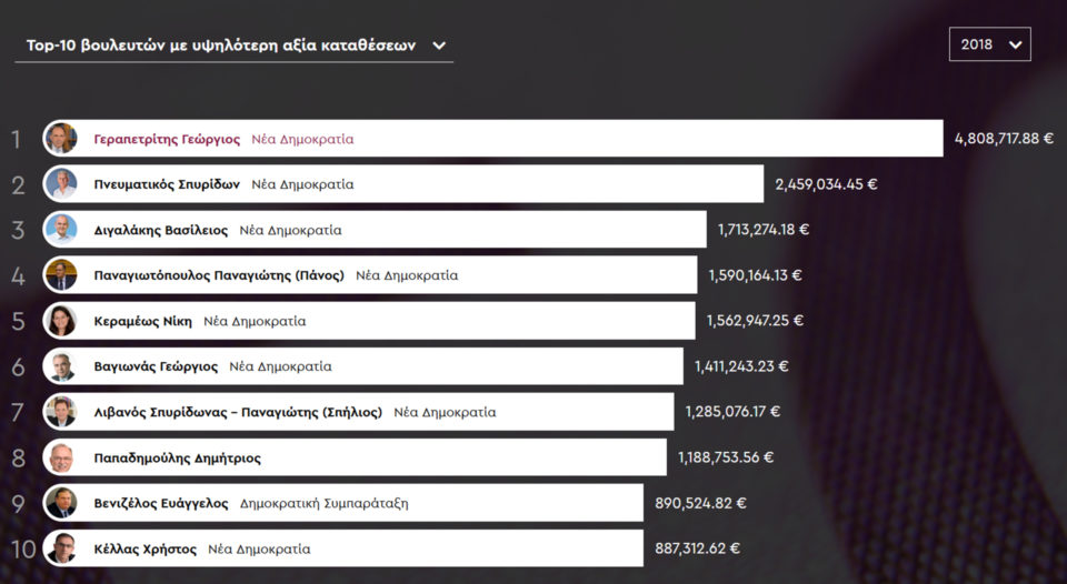 Το Vouliwatch, μία ανεξάρτητη μη κερδοσκοπική πρωτοβουλία ανοιχτής διακυβέρνησης και ενίσχυσης της διαφάνειας της Ελληνικής Βουλής, κατασκεύασε εφαρμογή στην οποία μπορεί κανείς να δει και να συγκρίνει την περιουσιακή κατάσταση των Βουλευτών μας από το 2012 έως και το 2018, με όλους τους πιθανούς τρόπους. Μπορεί κάποιος να συγκρίνει όλα τα περιουσιακά στοιχεία και τις μεταβολές τους ανά χρονιά και ανά κατηγορία (είδος περιουσίας, εισοδήματα, ακίνητα κ.ο.κ.), την περιουσιακή κατάσταση μεταξύ δύο διαφορετικών Bουλευτών επίσης ανά έτος και είδος περιουσίας, να δει τα Top 10 των Βουλευτών ανά εισόδημα, ακίνητη περιουσία, τραπεζικές καταθέσεις ή δάνεια. Επίσης μπορεί να συγκρίνει ανά κόμμα τον μέσο όρο περιουσίας των μελών του, μέσο εισόδημα Βουλευτή, μέσος αριθμό ακινήτων, μέσο όρο αξίας τραπεζικών καταθέσεων και αξίας δανείων ανά πολιτικό κόμμα.