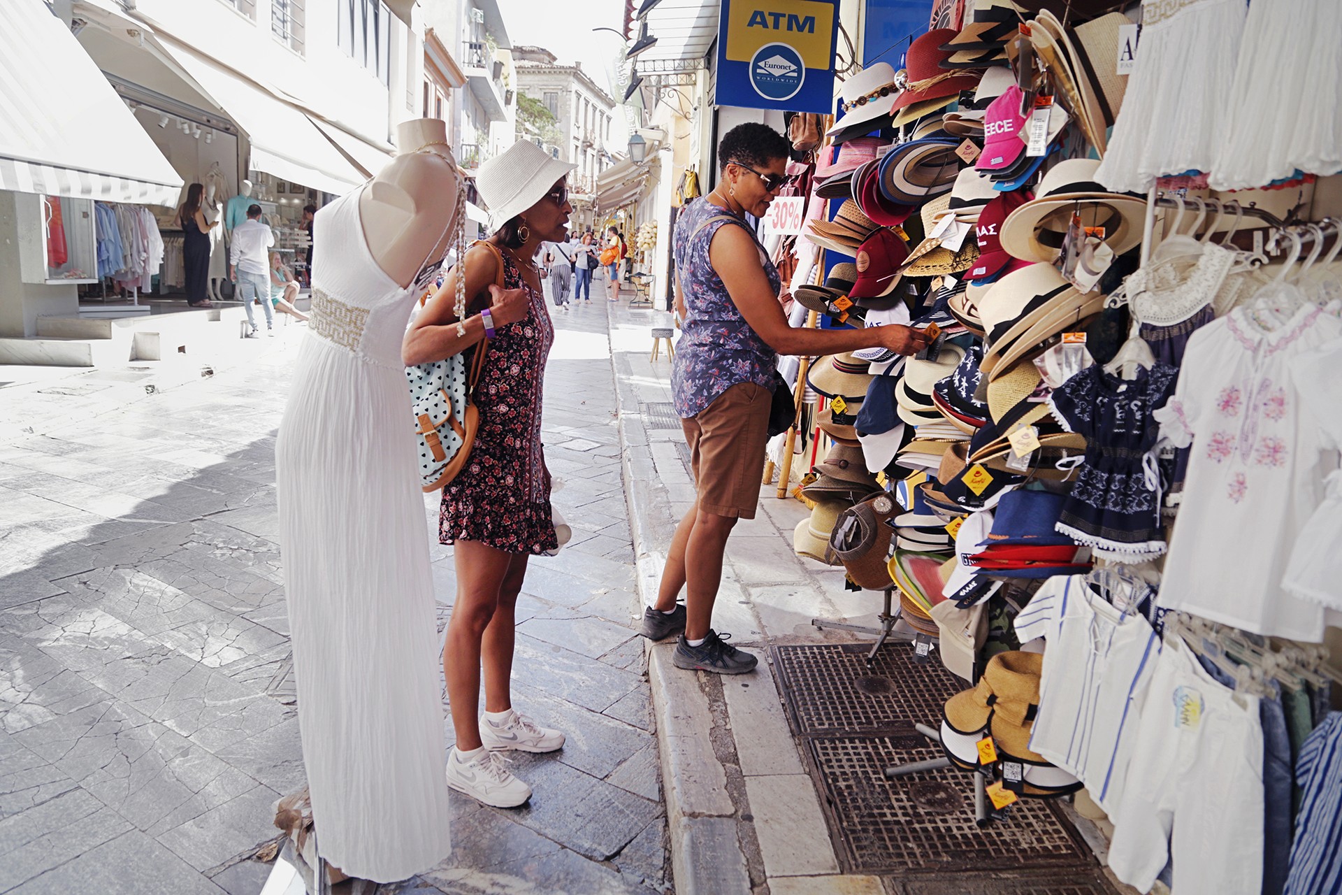 Στον ίδιο δρόμο τα τελευταία οχτώ χρόνια λειτουργεί ένα μαγαζί χωρίς όνομα που έχει μέσα όλη την αρχαία Ελλάδα: μυθικά πρόσωπα, φιλοσόφους, ναούς και θεούς σε διάφορα μεγέθη. Μπαίνουμε στο κατάστημα την ώρα που η πωλήτρια εξηγεί σε δύο Ελληνοαμερικανούς τον μύθο που στολίζει ένα πιάτο, σχετικά με την στενή πολιορκία της Δάφνης από τον θεό Απόλλωνα. Το ερωτικό ενδιαφέρον δεν ήταν αμφίδρομο και στην προσπάθειά της να τον αποφύγει, η νύμφη μεταμορφώθηκε στο γνωστό αρωματικό φυτό. Όσοι ψωνίζουν στον αριθμό 31, εκτός από να ακούνε αρχαιοελληνικούς μύθους, «επιλέγουν τον Παρθενώνα και την θέα Αθηνά, ξέρουν ποια πρόσωπα της ιστορίας τους ενδιαφέρουν κι έρχονται ενημερωμένοι». Συνήθως θέλουν να αγοράσουν κάτι φθηνό, όπως ένα πιάτο που απεικονίζει την θεά Άρτεμις, την Αθηνά και τον Ποσειδώνα ταυτόχρονα (για 3,50 ευρώ). Αγάλματα μεσαίου μεγέθους έχουν μέσο όρο τιμής τα 20 ευρώ, η τιμή ανεβαίνει για τα ογκώδη μαρμάρινα κρεμαστά διακοσμητικά τοίχου που μπορεί να κοστίζουν από 70 έως 100 ευρώ.