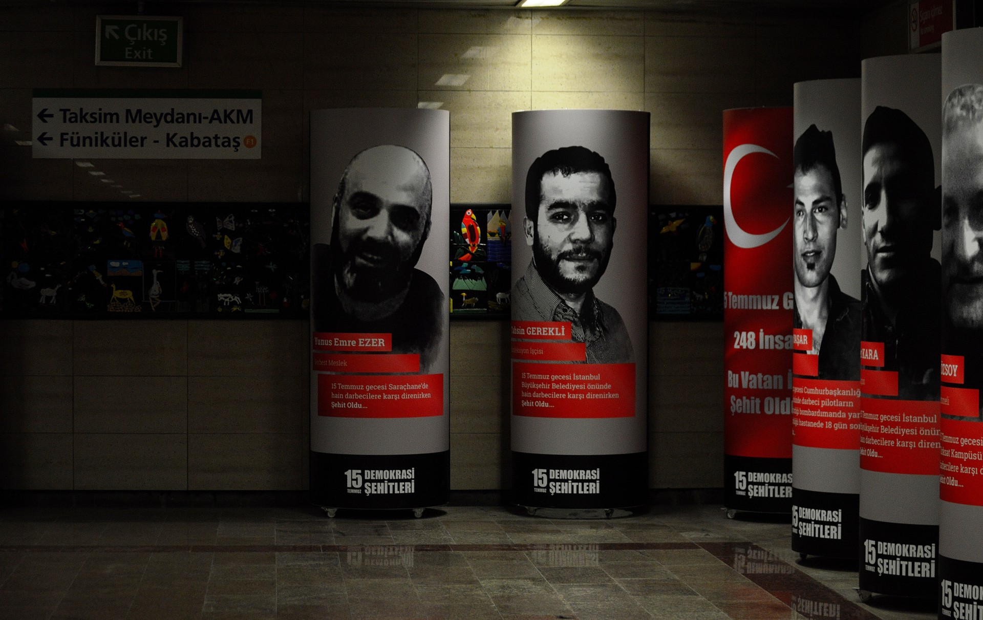 Στους διαδρόμους του μετρό που με έφεραν στην έξοδο της πλατείας Ταξίμ, είχαν στηθεί δεκάδες κύλινδροι ύψους δύο μέτρων ο καθένας, που είχαν τυπωμένες πάνω τους φωτογραφίες των «μαρτύρων της δημοκρατίας» του πραξικοπήματος της 15ης Ιουλίου. Κάθε φωτογραφία συνοδευόταν από μία σύντομη αφήγηση του ποιος ήταν ο καθένας τους, και πώς «προσέφεραν τη ζωή τους για την υπεράσπιση της δημοκρατίας» -ήταν δηλαδή οι άνθρωποι που σκοτώθηκαν κατά τη διάρκεια του πραξικοπήματος για να προστατέψουν το καθεστώς του Ερντογάν. Αυτοί οι νεκροί διατηρούνται ψηλά στην εθνική μνήμη, ή, περισσότερο, κατασκευάζονται ως αξιομνημόνευτοι από τον Κυρίαρχο Λόγο, αυτόν που επικράτησε μετά το πραξικόπημα , για τη «διατήρηση της δημοκρατίας» . Όλοι οι «άλλοι» που σκοτώθηκαν εκείνες τις μέρες, έχουν ήδη χαθεί.