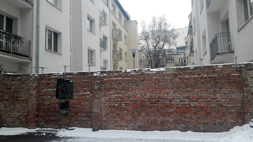 Λίγο πιο κει, διαγώνια και απέναντι από το νέο καπιταλιστικό ναό, θα βρεις αν ψάξεις και ρωτήσεις, στο 55 της οδού Sienna, ένα από τα δύο μοναδικά κομμάτια-απομεινάρι από τον τοίχο του περιβόητου «γκέτο» της Βαρσοβίας. (Το άλλο είναι ο τοίχος που δεσπόζει στο 11 της οδού Walikow, στα δυτικά της πόλης, κοντά στη μεγάλη συναγωγή).