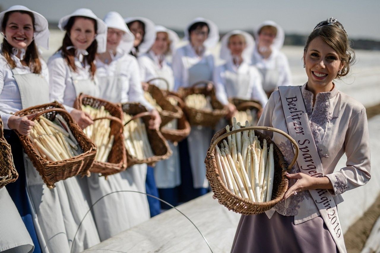 Στη φάρμα Klaistow της γερμανικής πόλης Beelitz η Σεζόν των Σπαραγγιών ξεκινά με τη συγκομιδή της σοδειάς από τους εργάτες αλλά και με την στέψη της Βασίλισσας των Σπαραγγιών που συνοδεύεται από γυναίκες ντυμένες με παραδοσιακές φορεσιές. Τα λευκά σπαράγγια φυτρώνουν και αναπτύσσονται μέσα στη γη, προστατευμένα από την άμεση έκθεση στον ήλιο και αυτό ακριβώς τα εμποδίζει να αποκτήσουν πράσινο χρώμα.
