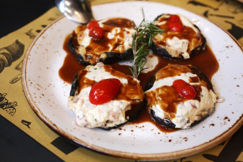 Ψητό Πορτομπέλο με τραγανό μπέικον, ζαμπόν και cream cheese.