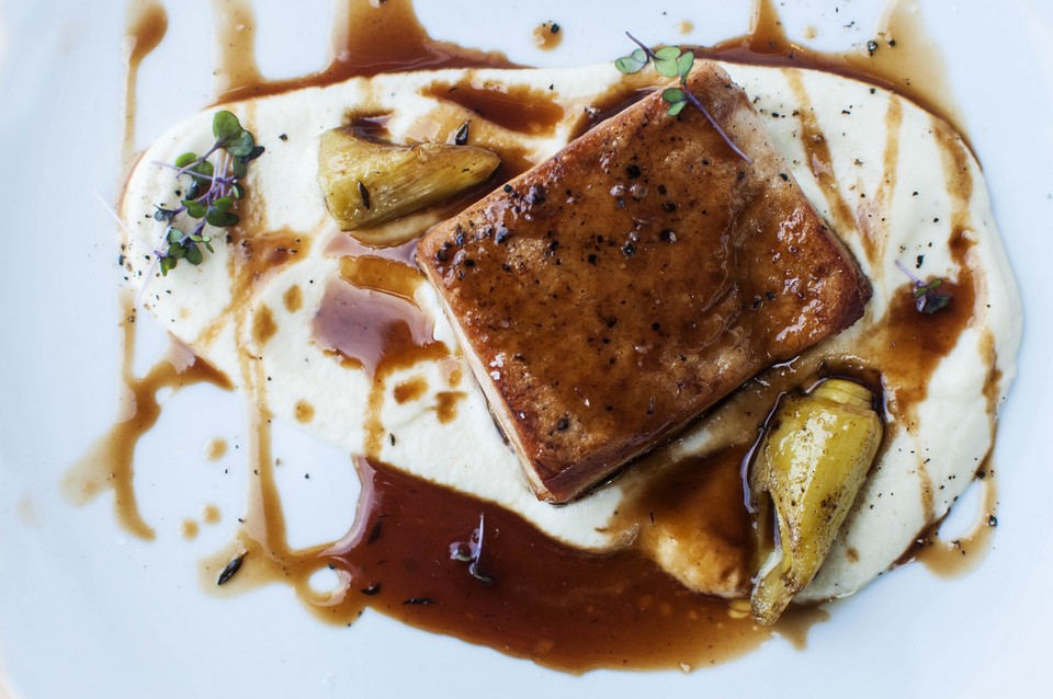 Πανσέτα sous-vide με πουρέ σελινόριζας και confit πράσο