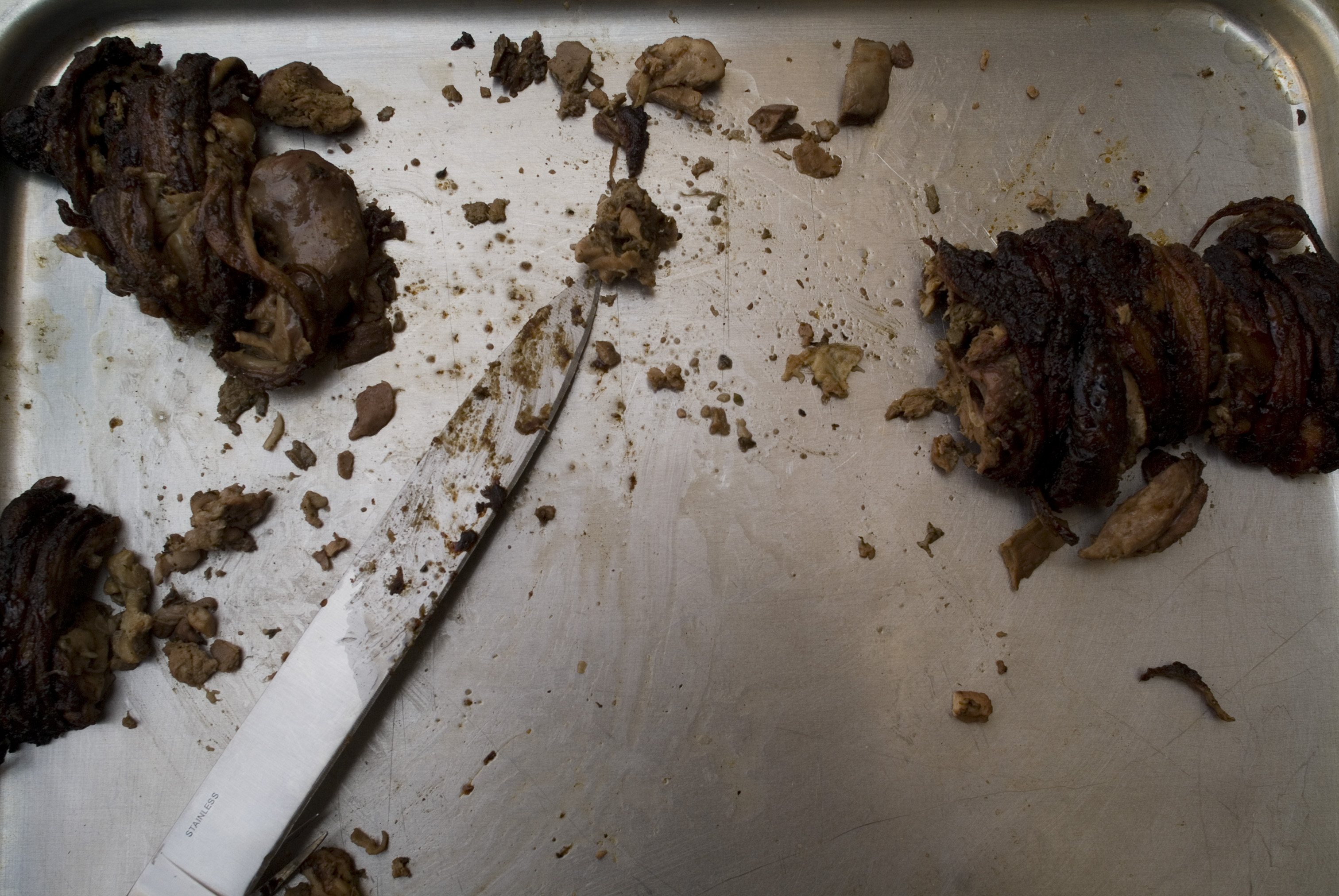 Kokoretsi, a traditional dish made from lamb intestines, served on Sunday of Easter, Athens, Greece, May 2005 / ÊïêïñÝôóé, ÊõñéáêÞ ôïõ ÐÜó÷á óôçí ÁèÞíá, ÌÜéïò 2005