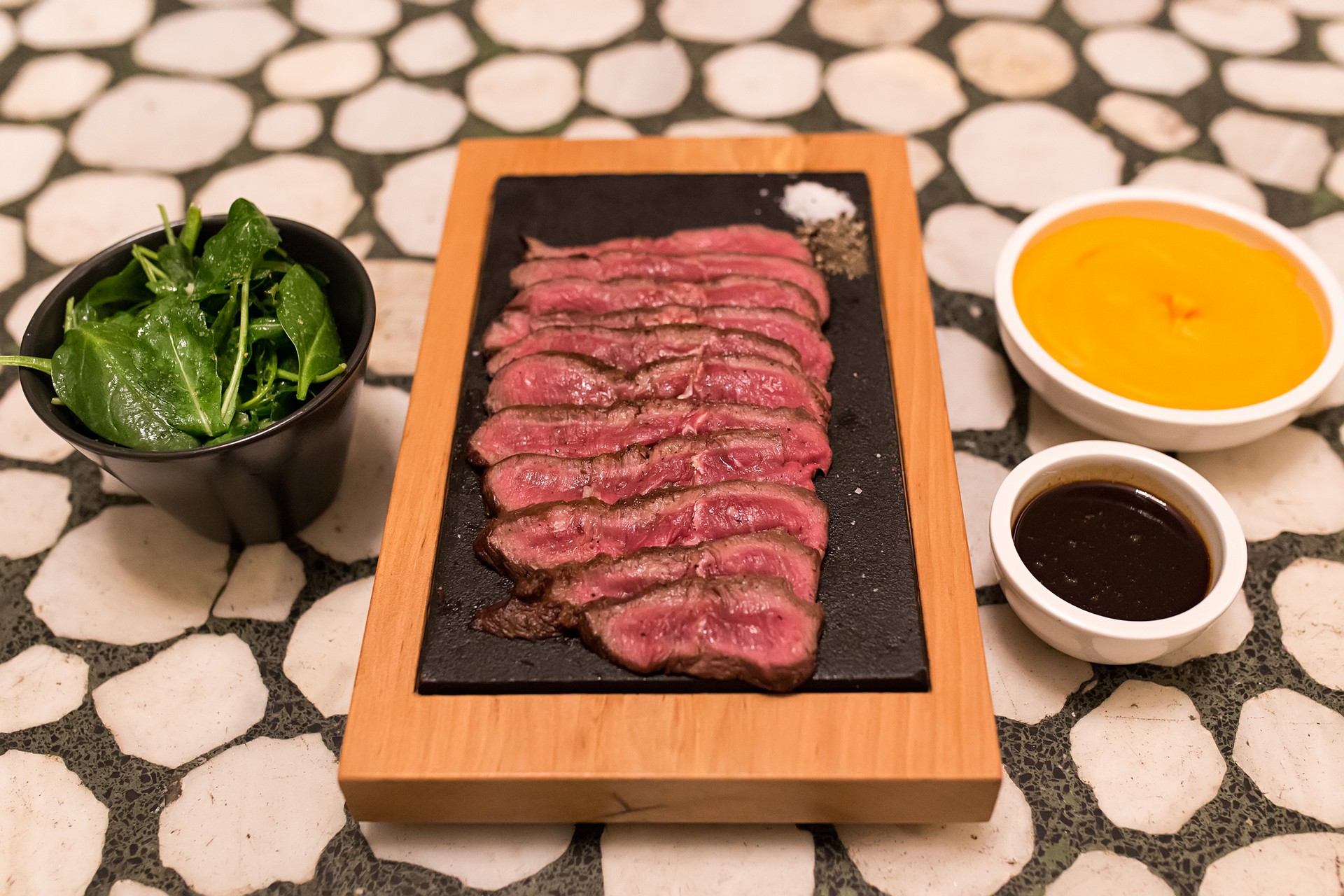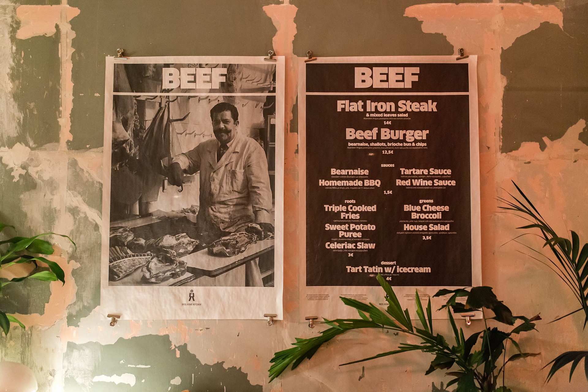 Γιατί επέλεξαν το κρέας ως πρωταγωνιστή στην κουζίνα τους; «Γιατί είναι μια πρώτη ύλη που αγαπούν πολλοί γιατί ταιριάζει με πολλά side πιάτα, γιατί είναι η αδυναμία μας». Προσφέρουν πρώτες ύλες υψηλής ποιότητας σε χαμηλή τιμή, το Aberdeen Angus μοσχάρι με το οποίο δουλεύουν είναι Ουρουγουάης, σερβίρεται medium-rare και άνω ενώ μαγειρεύεται με τη μέθοδο sous vide. Tα δύο κυρίως πιάτα κοστίζουν 12,50 και 14 ευρώ.