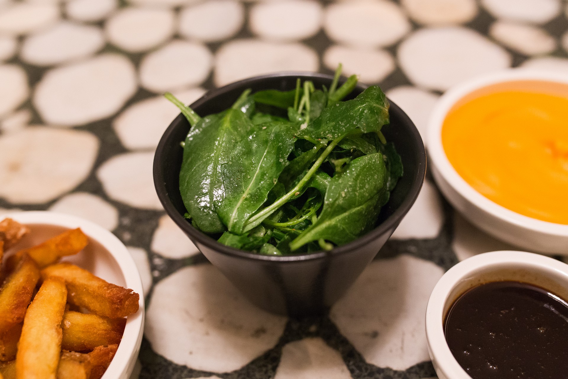 Στην κατηγορία “roots” θα βρείτε τριπλομαγειρεμένες τηγανιτές πατάτες, ένας άψογος πουρές γλυκοπάτατας με καπνιστή πάπρικα, σελινόριζα με μήλο και φρέσκα μυρωδικά (3 ευρώ) ενώ στις «πράσινες» προτάσεις υπάρχει ένα φοβερό μπρόκολο με μπλε τυρί, πιπεριά τσίλι και σωταρισμένα κρεμμύδια ανάμικτη πράσινη σαλάτα με vinegraite φράουλας, γραβιέρα και κρουτόνς (3,50 ευρώ)
