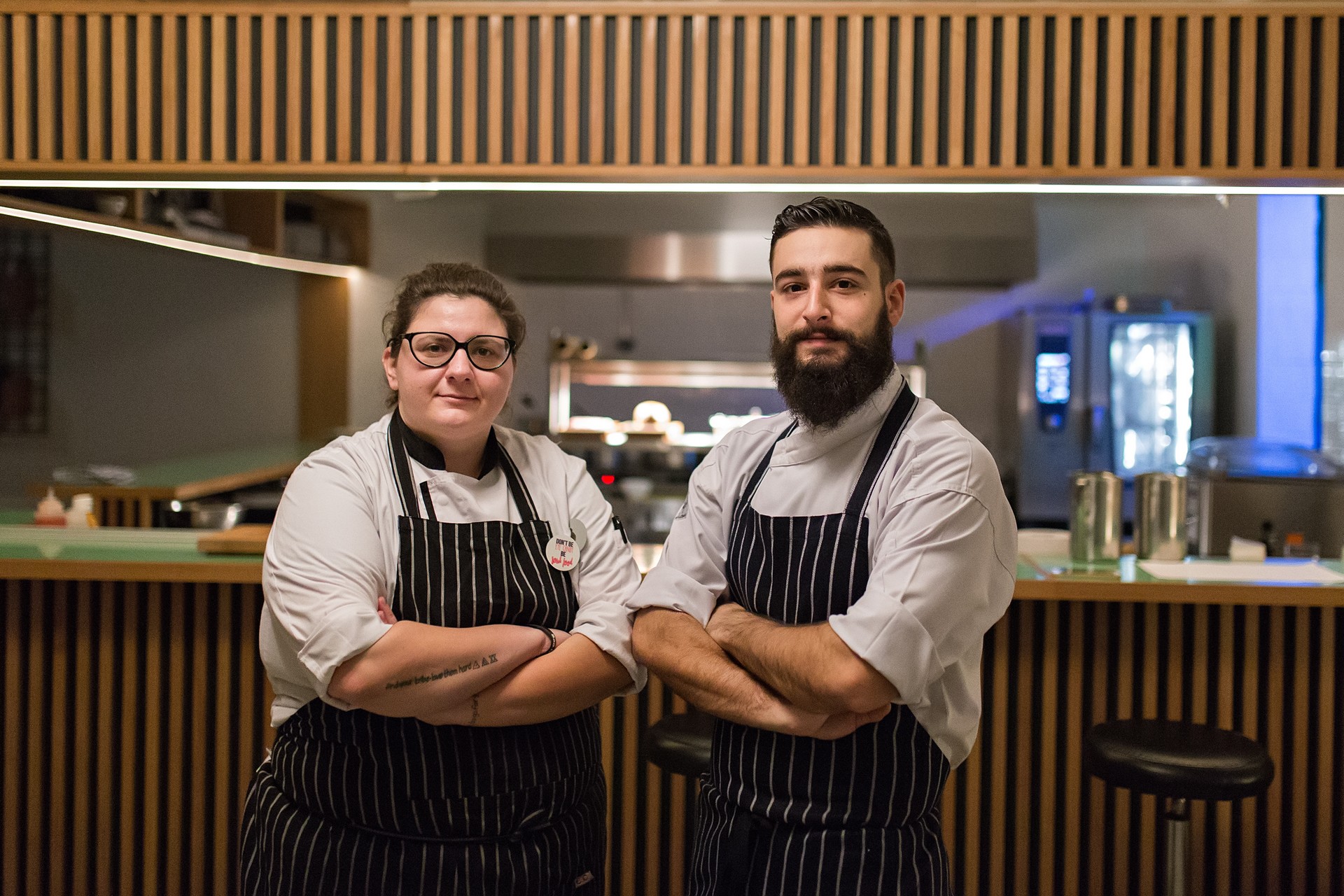 Εκείνος ασχολείται με τον τεχνολογικό πειραματισμό στην γεύση, εκείνη δοκιμάζει τα όρια συνάντησης της εντοπιότητας με τη σύγχρονη διεθνή κουζίνα. Οι δρόμοι τους συναντήθηκαν στο τηλεοπτικό Master Chef και η ιδιοσυγκρασία τους ταίριαξε άψογα με την οικειότητα μιας κατοικίας που αποπνέει ο πρώτος όροφος του Bios. Σε μια αστική αισθητική και περιτριγυρισμένοι από εικόνες κρεοπωλών της Αθήνας των αρχών του 20ου αιώνα εκείνοι συνεργάζονται στην ανοιχτή κουζίνα -που διαθέτει και stools, ακολουθώντας την τάση για «φαγητό στη μπάρα»- κάνοντάς μας να νιώθουμε λες και βρισκόμαστε στο δείπνο ενός καλού μας φίλου.