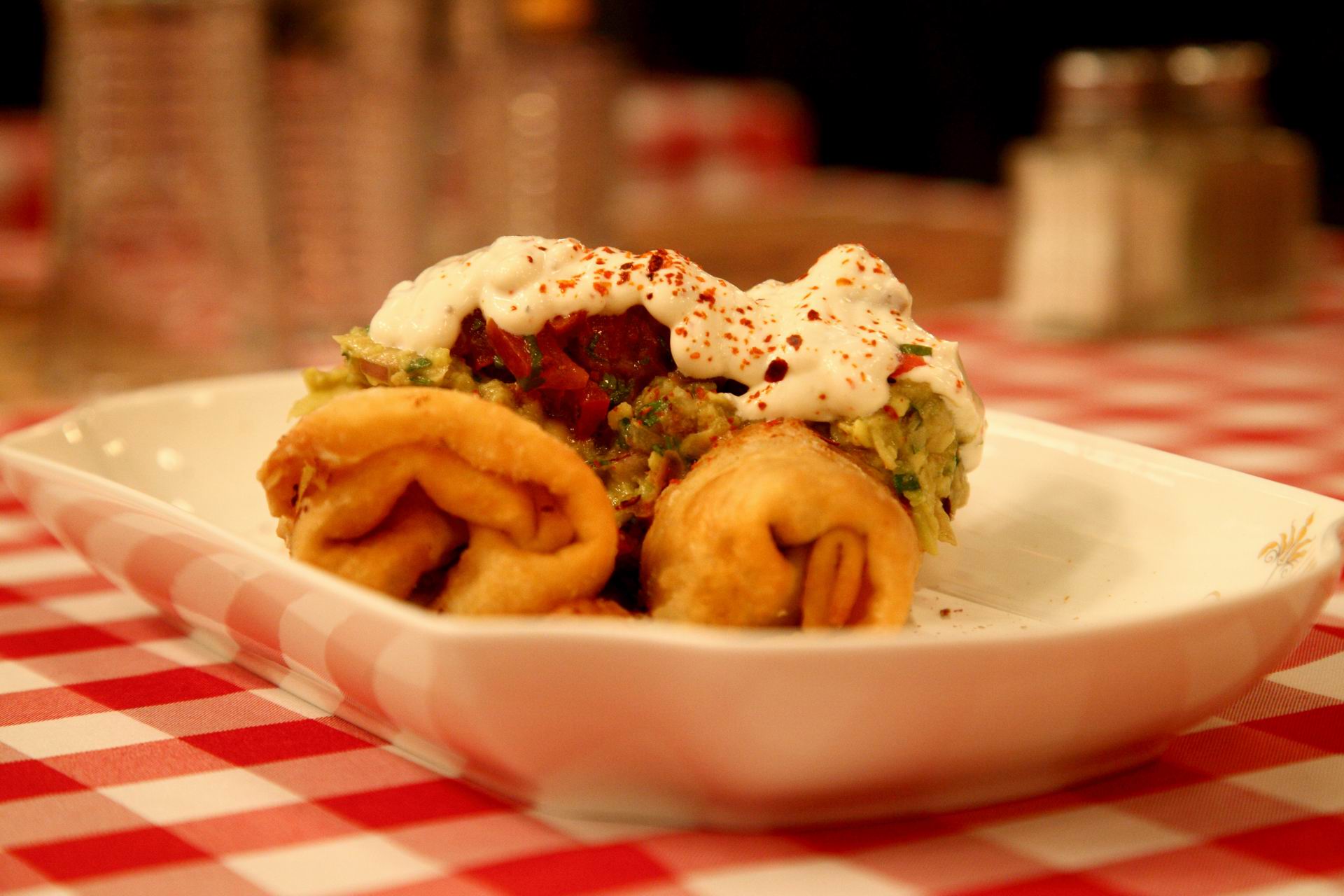 Taquitos με μαγειρεμένο μοσχαράκι, cheddar, τηγανητή τορτίγια, pico di gallo και sour cream