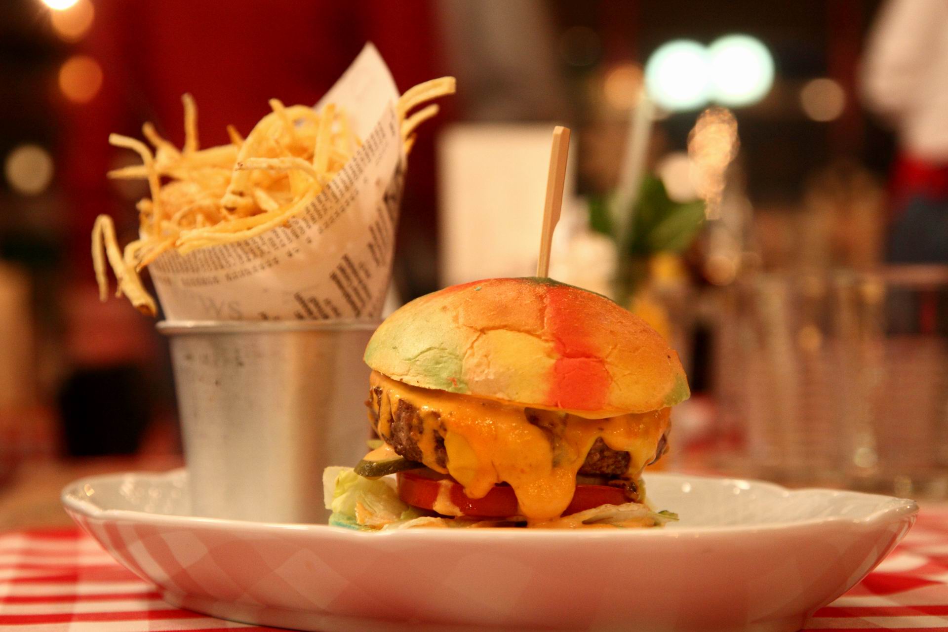 Classic All American Burger με μπιφτέκι black angus, τσένταρ, γλυκιές πίκλες,, icebrg, ντομάτα, κρεμμύδι και Big Boy sauce (πολύχρωμο για τις ανάγκες ενός πάρτι την ημέρα που επισκεφτήκαμε το Big Boy)