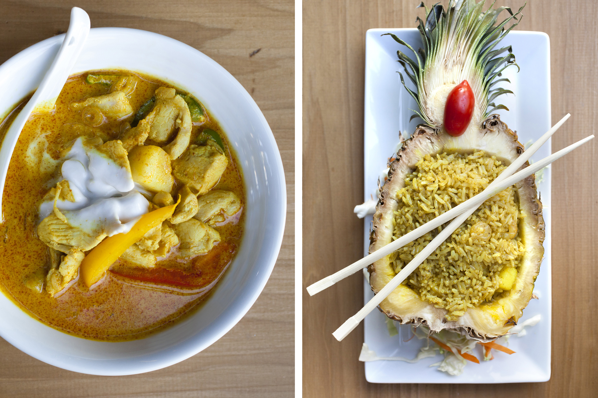 Για αρχή μας προσφέρει δύο σούπες, την Tom Kha Gai -πικάντικη με γάλα καρύδας, γκαλάνγκαλ, φύλλα λάιμ και κοτόπουλο -τρομερά γευστική και την Gwaytio Nuea Nam, κολασμένα αρωματική με μοσχαράκι και νουντλς ενώ στο τραπέζι σερβίρεται μία δροσερή σαλάτα µε µάνγκο, φρέσκο κρεµµύδι και γαρίδες, από τις πιο νόστιμες πικάντικες σαλάτες που έχω δοκιμάσει. Στη συνέχεια ακολουθεί ένα κρεμώδες yellow curry, coconut pineapple fried rice -τηγανητό ρύζι με καρύδα το οποίο στο σερβίρουν μέσα σε φρέσκο ανανά, τα chicken satay -στικς κοτόπουλου με σάλτσα από φυστικοβούτυρο και ένα Phad Thai – νουντλς ρυζιού με γαρίδες, tamarino τσίλι και μαύρη ζάχαρη, λάιμ και κοκοφοίνικα στο πλάι- απλά θεϊκό. Για επιδόρπιο έχουν σπιτικό παγωτό σε τρεις γεύσεις -lemongrass, καρύδα και μάνγκο -που συνοδεύεται με μία σος από καραμελωμένο τζίντζερ και λάιμ –φοβερά ασυνήθιστη και γευστική.