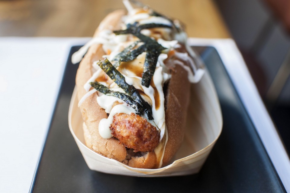 Katsu Dog, με λουκάνικο παναρισμένο με πάνκο, μαγιονέζα με wasabi, tonkatsu sauce, τουρσί τζίντζερ, λεπτοκομμένο λάχανο με καρότο, ψιλοκομμένο νόρι