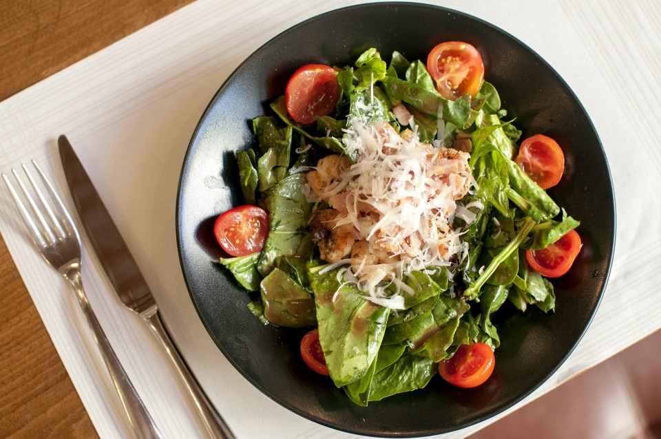 Σαλάτα με γαρίδες, μπέικον, σπανάκι, τοματίνια και παρμεζάνα