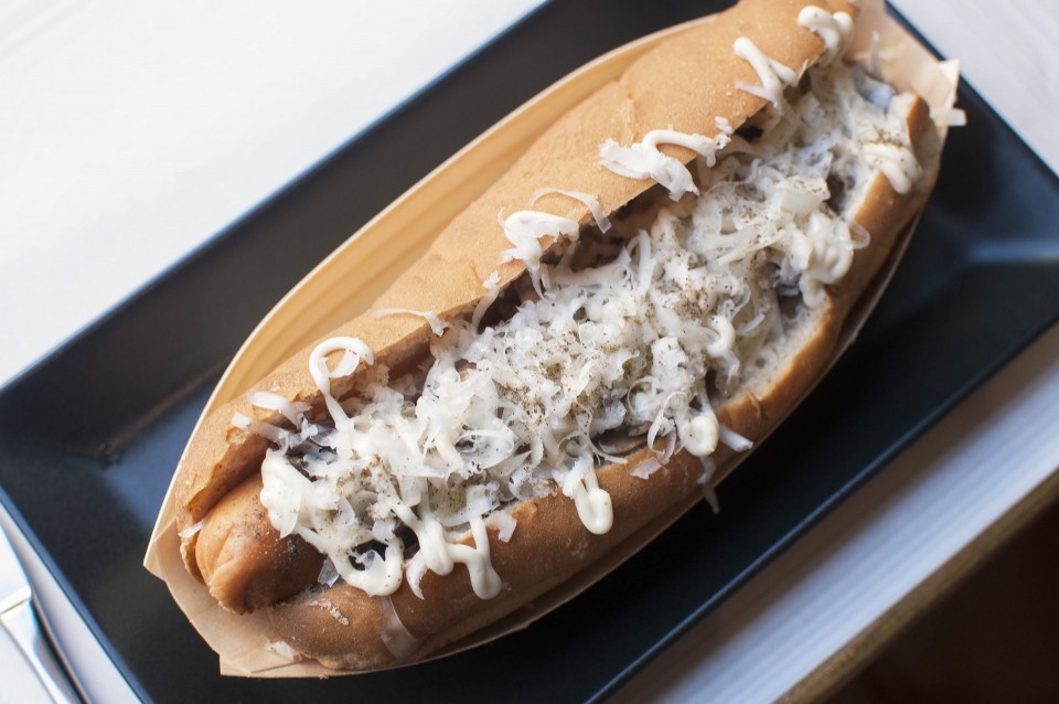 Truffle Dog με λουκάνικο, μαγιονέζα με λάδι τρούφας, καραμελωμένα κρεμμύδια, σωταρισμένα μανιτάρια, τυρί προβολόνε και φρεσκοτριμμένο μαύρο πιπέρι