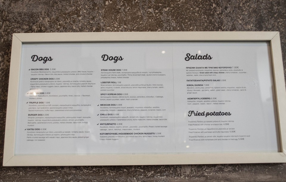Δεν αντέχω να προχωρήσω σε τρίτο hot dog αλλά παράλληλα με τα άλλα δύο δοκίμασα την εξαιρετική πραγματικά σαλάτα με γαρίδες, μπέικον, σπανάκι, τοματίνια και παρμεζάνα που θα προστεθεί σύντομα στον κατάλογο. Από τον κατάλογο ακόμη αλλιεύω ως επιλογές σε μια μελλοντική επίσκεψη μου το καυτερό Mexican Dog με λουκάνικο, λεπτοκομμένο τουρσί jalapeno, ντοματίνια και κόλιανδρο (6.00 €) όπως και το Lobster Roll με ψίχα αστακού, λεπτοκομμένο μαρούλι, μαγιονέζα με ξύσμα λεμόνι, πίκλα αγγούρι και φέτες ντομάτας (10.00 €).