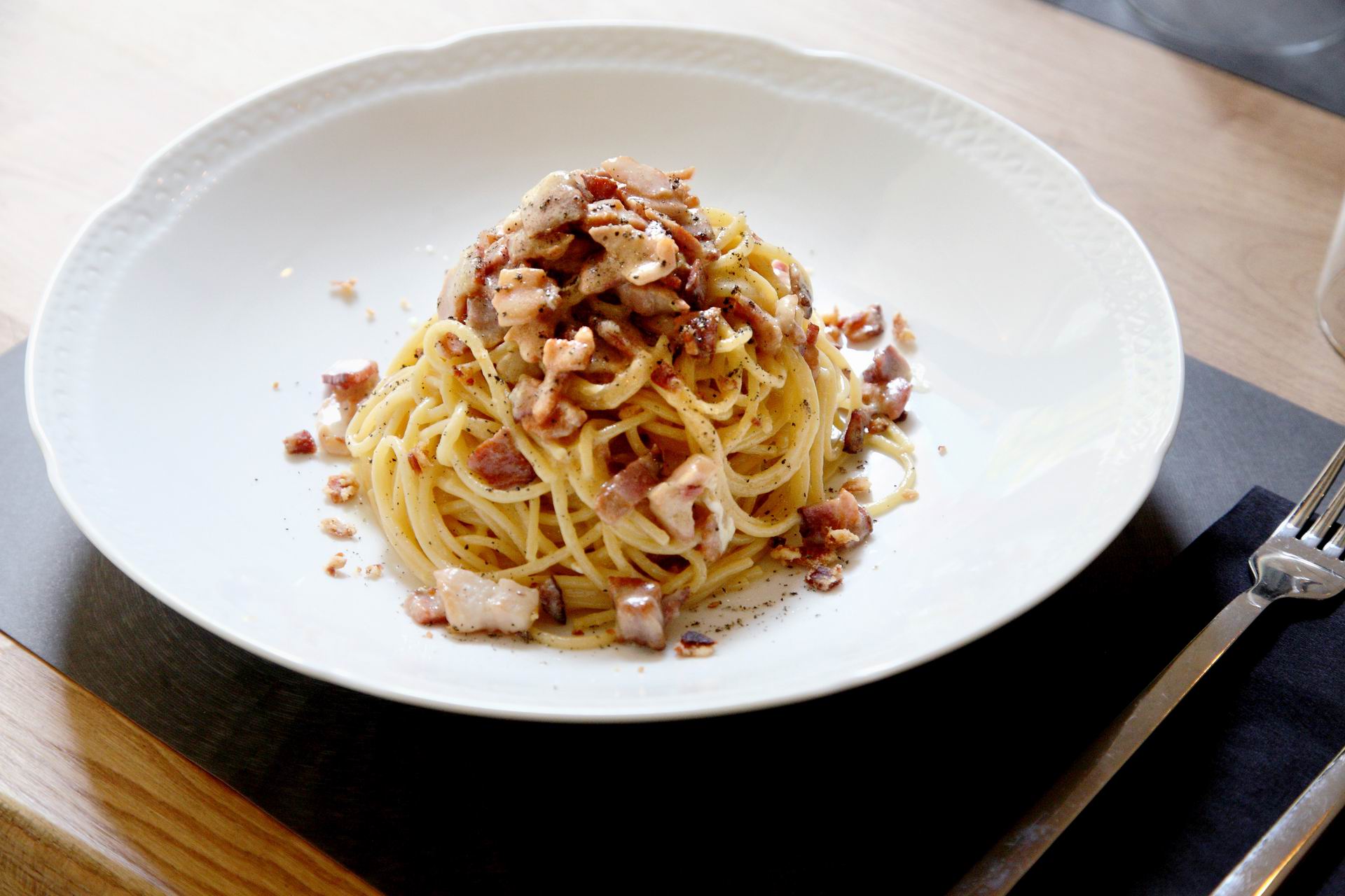 Αυθεντική σπαγγέτι καρμπονάρα με καπνιστή pancetta, κρόκο αυγού και pecorino