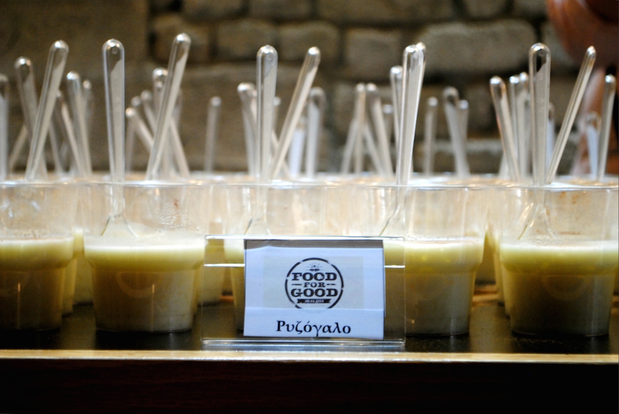 Φτάνοντας λίγο νωρίτερα, με υποδέχθηκαν μυρωδιές νοσταλγικές και ένα χαρούμενο βουητό. Μια μεγάλη ομάδα από food bloggers έτρεχε στο χώρο, φέρνοντας τάπερ, στήνοντας κατσαρόλες και στοιβάζοντας τα κυπελλάκια ρυζόγαλο που τόσο ανυπομονούσα να δοκιμάσω. Κάνοντας ένα γύρο, διαπίστωσα ότι τα φαγητά που ετοίμασε το Food for Good για σήμερα ήταν όσο πιο κυριακάτικα γίνεται. Παστίτσιο, σουτζουκάκια, χορτόπιτα, και ρολό κιμά, φαγητό μιας άλλης γενιάς όπως μου είπαν με χιούμορ τα κορίτσια. Με πέντε ευρώ λοιπόν για καλό σκοπό γεμίζεις το πιάτο σου με γεύσεις και αναμνήσεις. Τι καλύτερο; Τις λεπτομέρειες για τη δράση τις έμαθα μετά το φαγητό, από τις food bloggers Έλενα και Έυα, των elenaiscooking και funkycook.