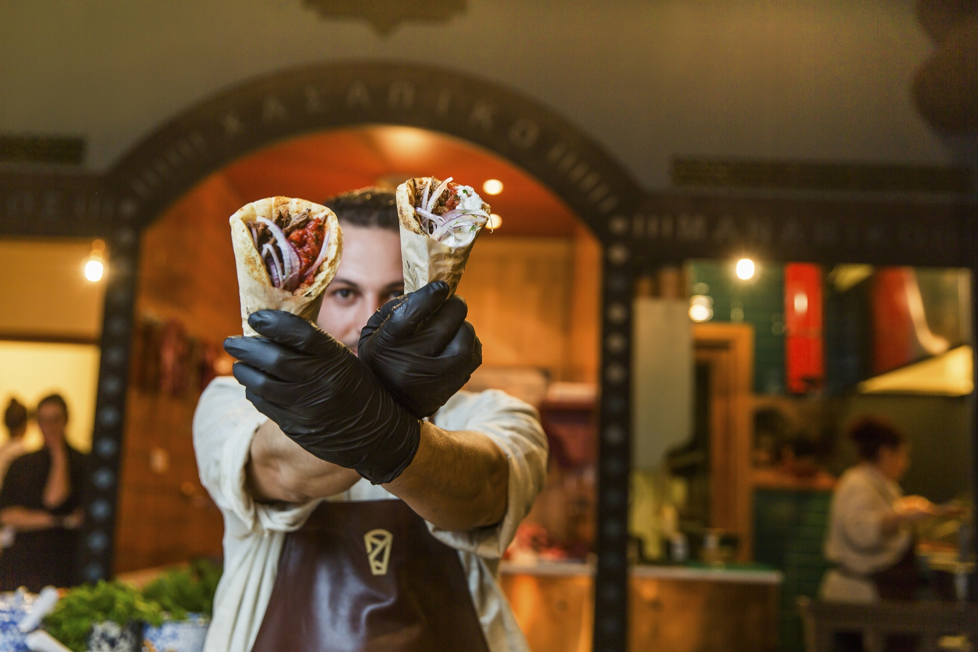 Η ιδιαιτερότητα έγκειται στο ότι στο πίσω μέρος του μαγαζιού θα δείτε έναν φούρνο, το χασάπικο και το μανάβικο. Στο πρώτο φτιάχνονται επιτόπου οι πίτες για τα τυλιχτά όσο και η ομολογουμένως καταπληκτικά αφράτη πίτα για την μερίδα, στο δεύτερο κόβεται real time το κρέας και στο μανάβικο βρίσκονται τα φρέσκα ζαρζαβατικά που χρησιμοποιούνται στις σαλάτες, στα τυλιχτά και στις μερίδες. Η διάταξη αυτή δεν εξυπηρετεί μόνο αισθητικούς σκοπούς -αν και γράφει φοβερά για φωτογραφίες στο instagram- αλλά βολεύει ώστε να δει ο πελάτης την όλη διαδικασία παραγωγής και προετοιμασίας αυτού που θα φάει. Επιπλέον, δίνει την αίσθηση μιας γειτονιάς μέσα στο ίδιο το μαγαζί, νομίζεις ότι αν κοιτάξεις λίγο πιο δεξιά θα δεις την πρόσοψη ενός σπιτιού όπου ζουν ο μανάβης, ο φούρναρης και ο χασάπης. Λες κι ένα μικρό γαλατικό χωριό που αγαπά το καλό κρέας ξεφύτρωσε στην πλατεία Αγίας Ειρήνης.
