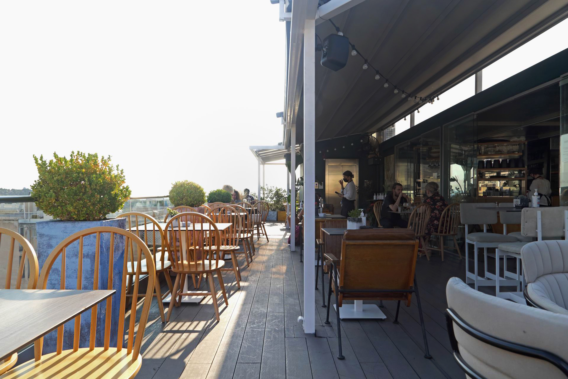 Ανεβαίνοντας κανείς στον 7ο όροφο του ξενοδοχείου Utopia, εντυπωσιάζεται αρχικά από την λιτή διακόσμηση της σκηνογράφου Μαριλένας Καλιτζαντωνάκη, η οποία έχει επιρροές από τα ’60s και τα ’70s. Μεγάλα κασπό με πράσινα φυτά και μικρός εσωτερικός χώρος που φιλοξενεί το μπαρ, ο οποίος διαχωρίζεται με μια απλή, περιμετρική τζαμαρία, για να μπορεί κανείς να απολαμβάνει από κάθε σημείο τη θέα.
