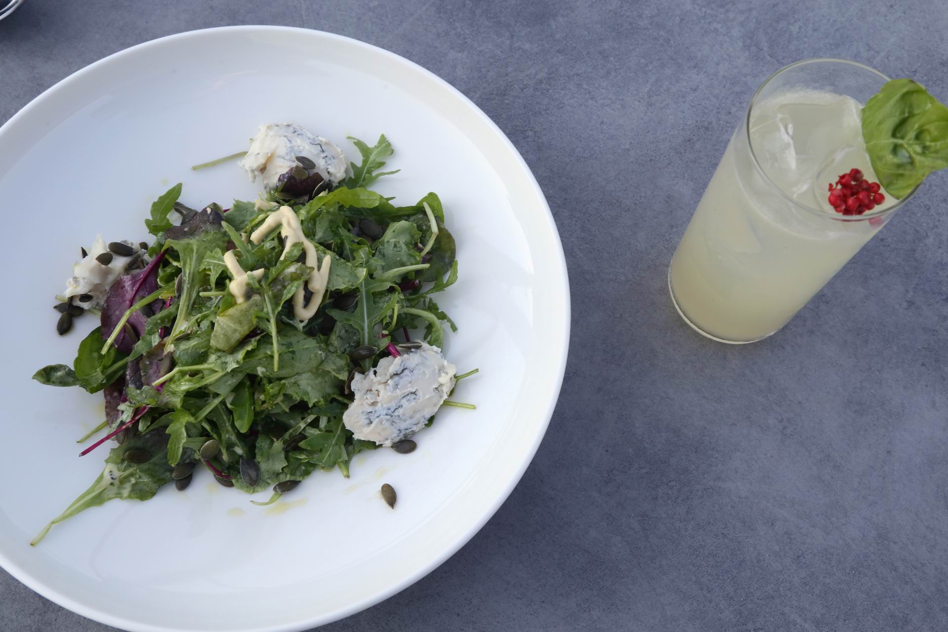 Πράσινη σαλάτα με γκοργκοντζόλα, ταχίνι και ηλιόσπορο.