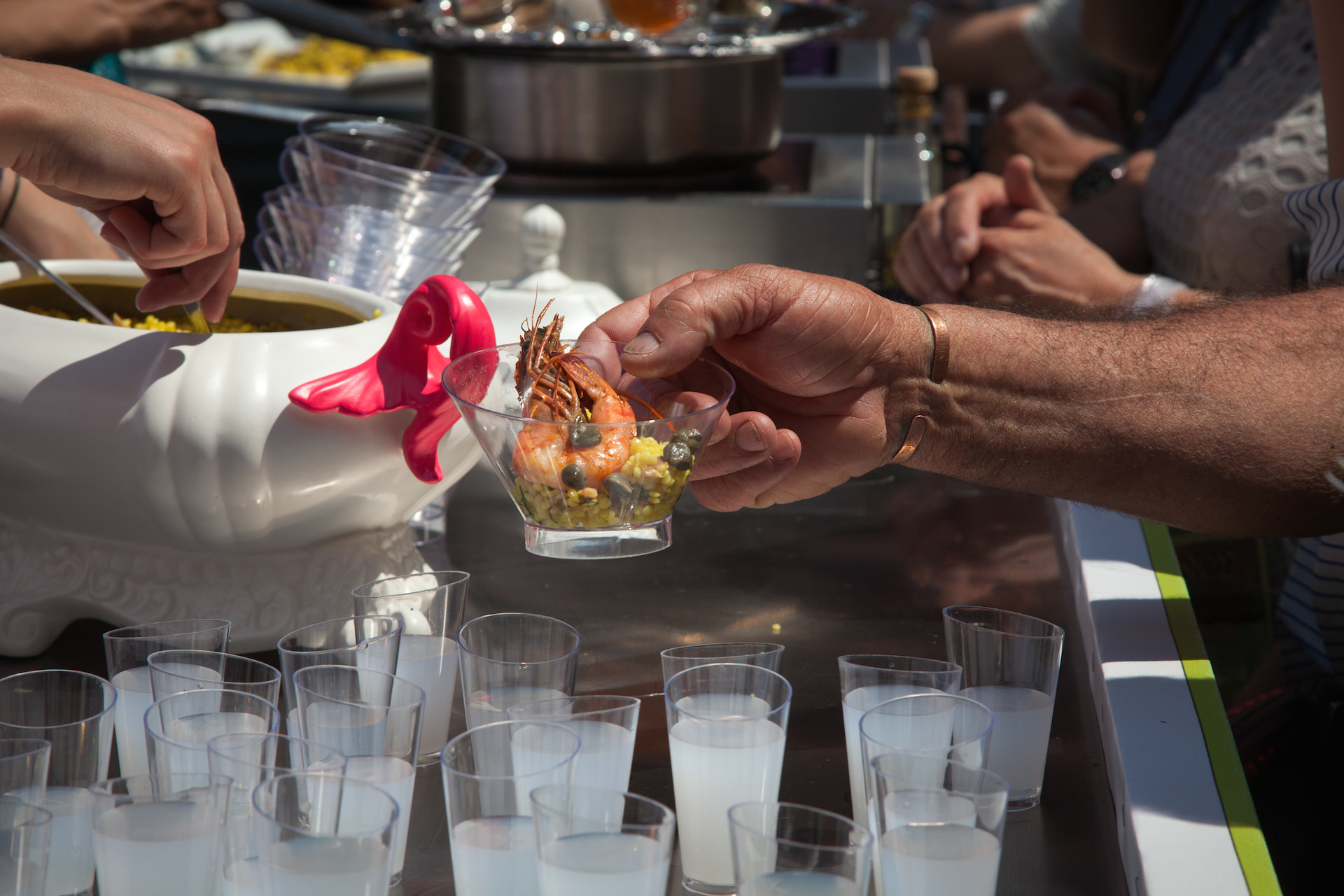Στο Αίθριο του Μουσείου Μπενάκη, περιμετρικά καλοστημένα περίπτερα μικρών παραγωγών με νοστιμιές από τα νησιά των Κυκλάδων κέρδιζαν τις εντυπώσεις με κεράσματα, χαμόγελα και συζητήσεις, γύρω από τα προϊόντα που πουλούσαν. Ενδεικτικά, υπήρχαν τυριά από τον ΕΑΣ Νάξου, γλυκά από τα Παραδοσιακά Εδέσματα Μήλου ή από την εταιρεία «Σύρου Εδέσματα», ζυμαρικά από την οικοτεχνία Δελατόλα στην Τήνο, κρασιά από το κτήμα Σιγάλα και από την Ένωση SantoWines κ.α. Την παράσταση όμως έκλεψε η μεγάλη κουζίνα στο κέντρο που, ανά τακτά χρονικά διαστήματα, φιλοξενούσε πολλούς σεφ, οι οποίοι με χαρά μαγείρευαν επί τόπου συνταγές εμπνευσμένες από τις Κυκλάδες, εξηγώντας τον τρόπο και τα «μυστικά» στο κοινό που παρακολουθούσε. Ξεχώρισαν, το λουκουμαδάκι γραβιέρας Νάξου με μαρμελάδα ντομάτας, βασιλικό και αφρό μαστίχας -από το σεφ του Olive Garden στο Titania Hotel, Αλέξανδρο Χαραλαμπόπουλο-, η θρυλική αστακομακαρονάδα του εστιατορίου Ο Νικόλας της Σχοινούσας, από τη Σοφία Παπαδημητρίου και οι κυκλαδίτικοι τυρολουκουμάδες – σφουγγάτα του Γιάννη Γαβαλά από το εστιατόριο «Bakalo» της Μυκόνου