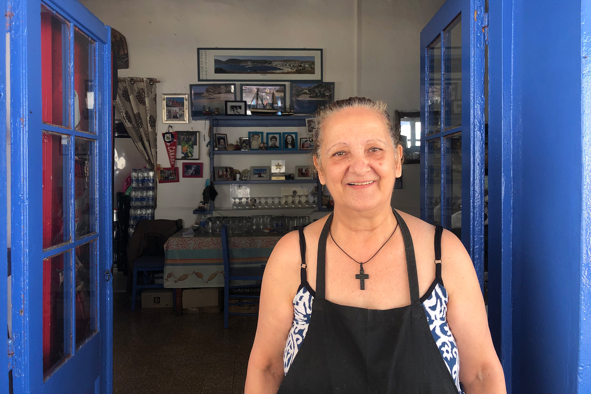 Η κυρία Δέσποινα Παντέλλου στο ταβερνάκι της, Du Moulin, στην κεντρική γραφική μινιόν πλατεία των Λειψών.
