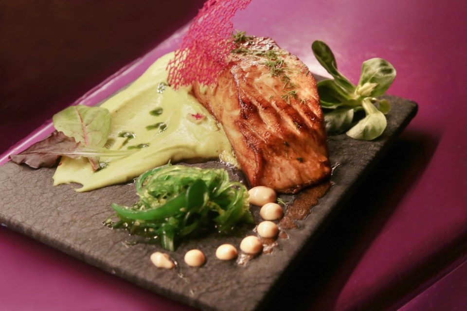 Φιλέτο σολομού με κρέμα πράσινης φάβας, φύκια και μοσχολέμονο.