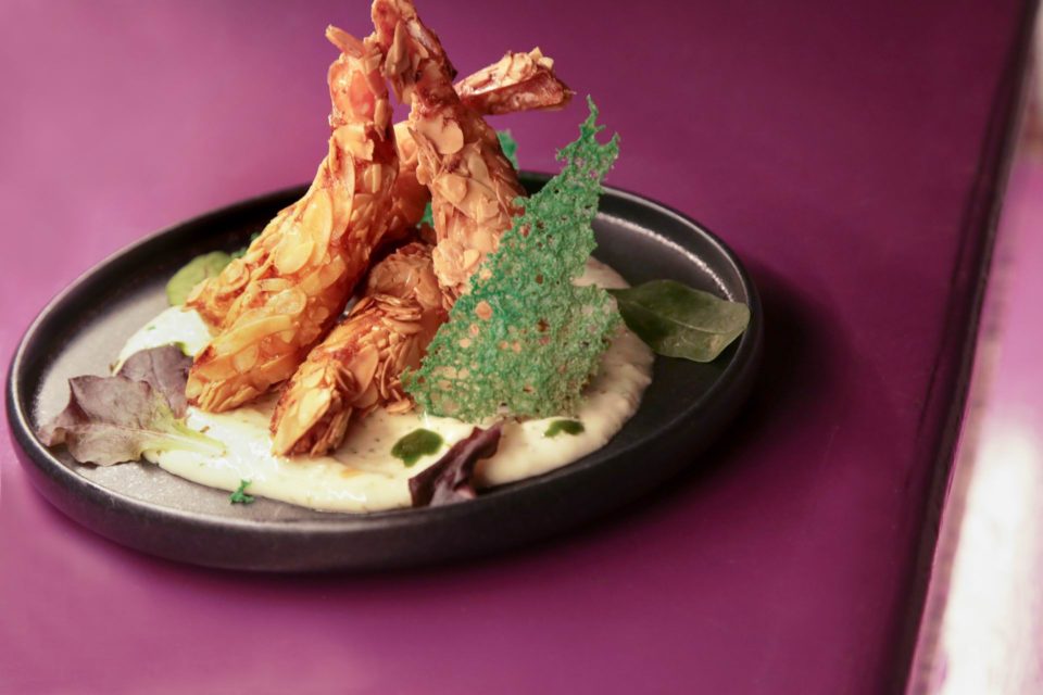 Γαρίδες σε κρούστα αμυγδάλου, συνοδευόμενες από πράσινη σαλάτα και σάλτσα ούζου.