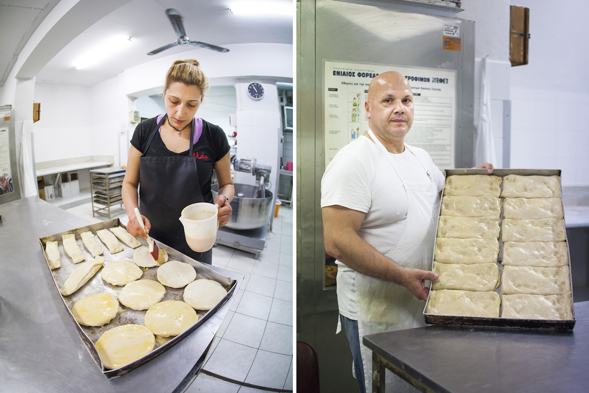 Στο παρασκευαστήριο της Πεσμαζόγλου συναντάω τον Βασίλη που έμαθε την τέχνη του ζυμώματος δίπλα στον κύριο Γιάννη και ξέρει όλα τα μυστικά. «Εδώ όλα ζυμώνονται στο χέρι» μου εξηγεί «δεν σταματάμε να φουρνίζουμε ποτέ ενώ τα υλικά που χρησιμοποιούμε παραμένουν τα ίδια όπως παλιά -μαναβική από την κεντρική αγορά, ελληνικά αυγά από τα Μέγαρα από τον γκουρού των αυγών Δημήτρη Ραγκούση στο Νέο Κόσμο που είναι συνεργάτης μας πάνω από 70 χρόνια, βούτυρο γάλακτος από γειτονικό μαγαζί στην Ευρυπίδου, άλευρα από τους Μύλους Θράκης και βαρύτητα στην καθαριότητα- τίποτα βιομηχανικό και φυσικά κανένα υποκατάστατο στα τυριά».