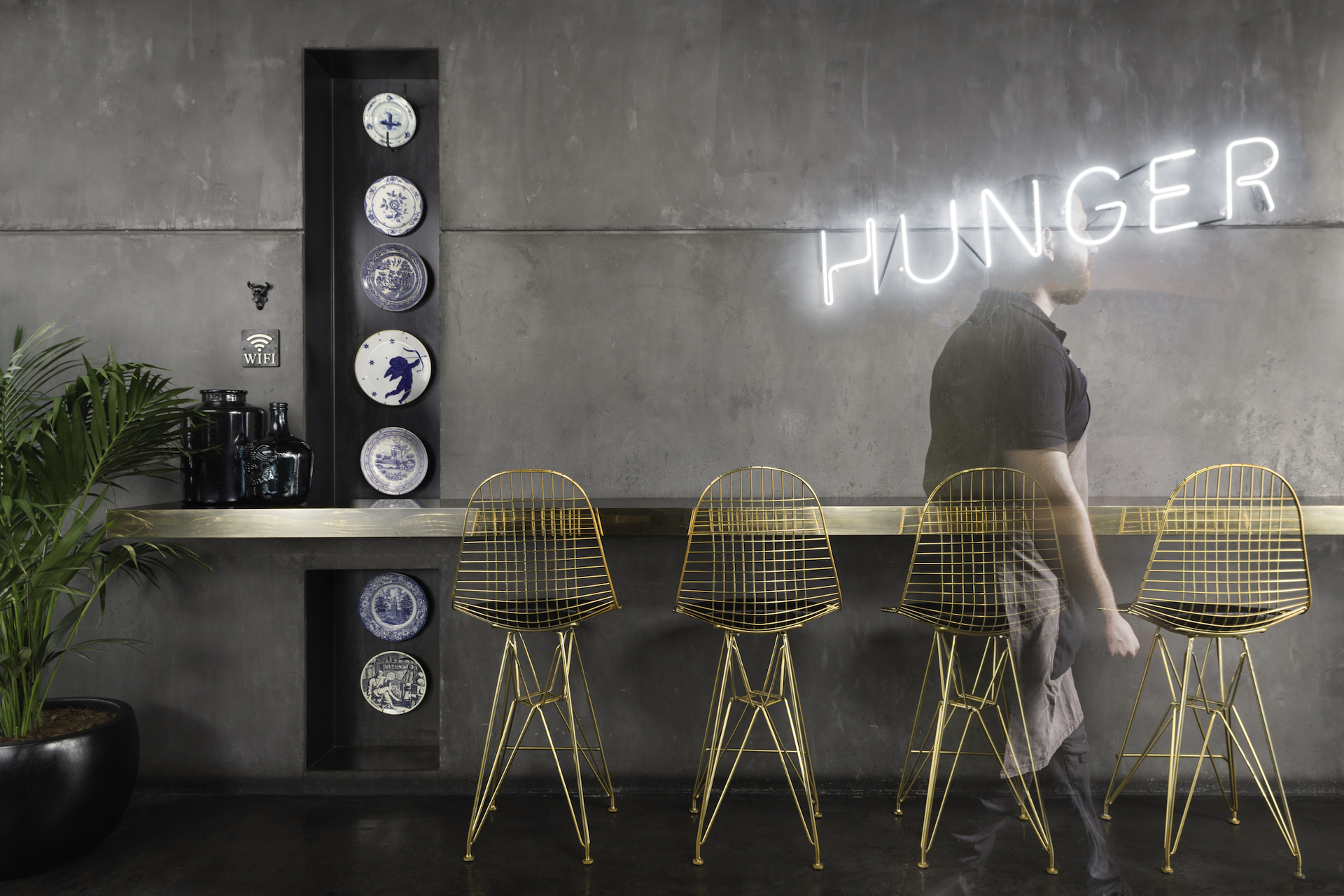 Στη σάλα και την outdoor serving area κυριαρχεί η αθηναϊκή αστική κομψότητα, με τον γυαλισμένο μπρούτζο, τη μαύρη formika, τα φυτά και τα κλασικά πιάτα στους τοίχους που θυμίζουν τραπεζαρία της γιαγιάς.