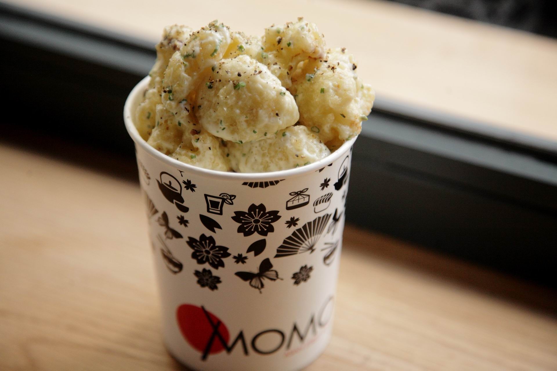 Ο Δημήτρης Liem με καταγωγή από την Ινδονησία και πολύχρονη εμπειρία στο χώρο της ασιατικής κουζίνας μας πρότεινε για ορεκτικό Cauliflower pops (3,90€), δηλαδή κουνουπίδι – ένα ασυνήθιστο προϊόν που δεν αρέσει σε πολλούς – τηγανιτό tempura (ιαπωνική τεχνική τηγανίσματος σε κουρκούτι). Ένα από τα πιο απροσδόκητα και επιτυχημένα πιάτα του MOMO. Γαρνίρεται με σως aioli, η οποία περιέχει μαγιονέζα, σκόρδο, λεμόνι, φρέσκο πιπέρι και σχοινόπρασο για μια πιο ευρωπαϊκή προσέγγιση στη γεύση.