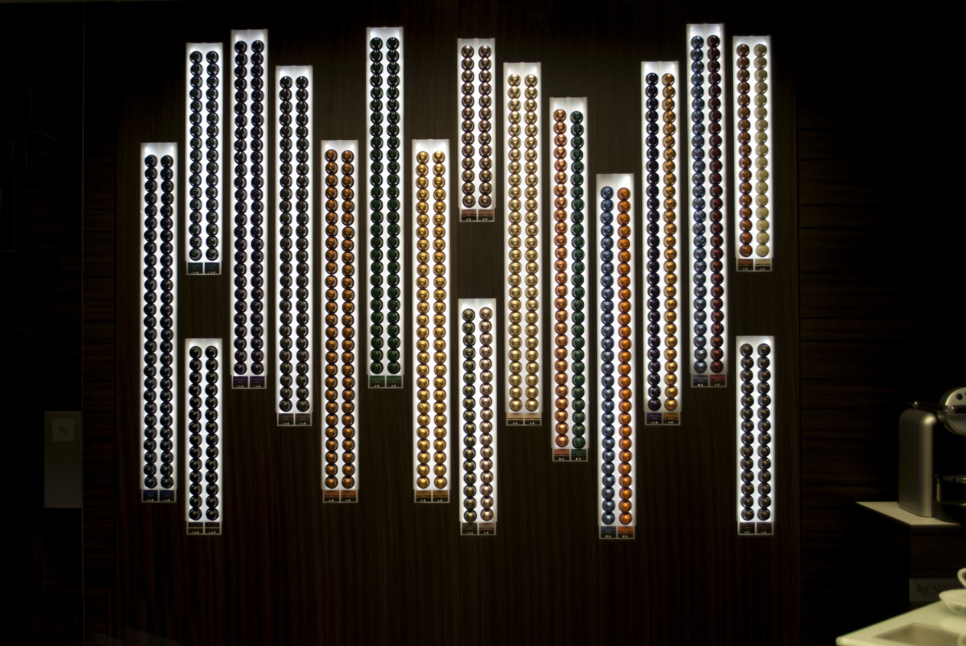 Μπαίνοντας στο κατάστημα, οι ειδικοί του καφέ σε προσεγγίζουν και σου προτείνουν κάποιες από τις 23 ποικιλίες καφέ που ταιριάζουν στο γούστο και τις επιθυμίες σου. Οι κάψουλες με τις ποικιλίες είναι γεωμετρικά τοποθετημένες σε τετράγωνα ραφάκια και το διαφορετικό χρώμα της κάθε μίας συμβολίζει την ιδιαίτερη γευστική της προέλευση. Για να γίνει όμως η εμπειρία ακόμη πιο ολοκληρωμένη, σε μια ζεστή γωνιά στο βάθος του μαγαζιού βρίσκεται ένα κυκλικό μπαρ, στο οποίο μπορείτε να χαλαρώσετε και να δοκιμάσετε κάθε ποικιλία καφέ από τους ειδικούς, προκειμένου να ανακαλύψετε την ιδανική για εσάς.