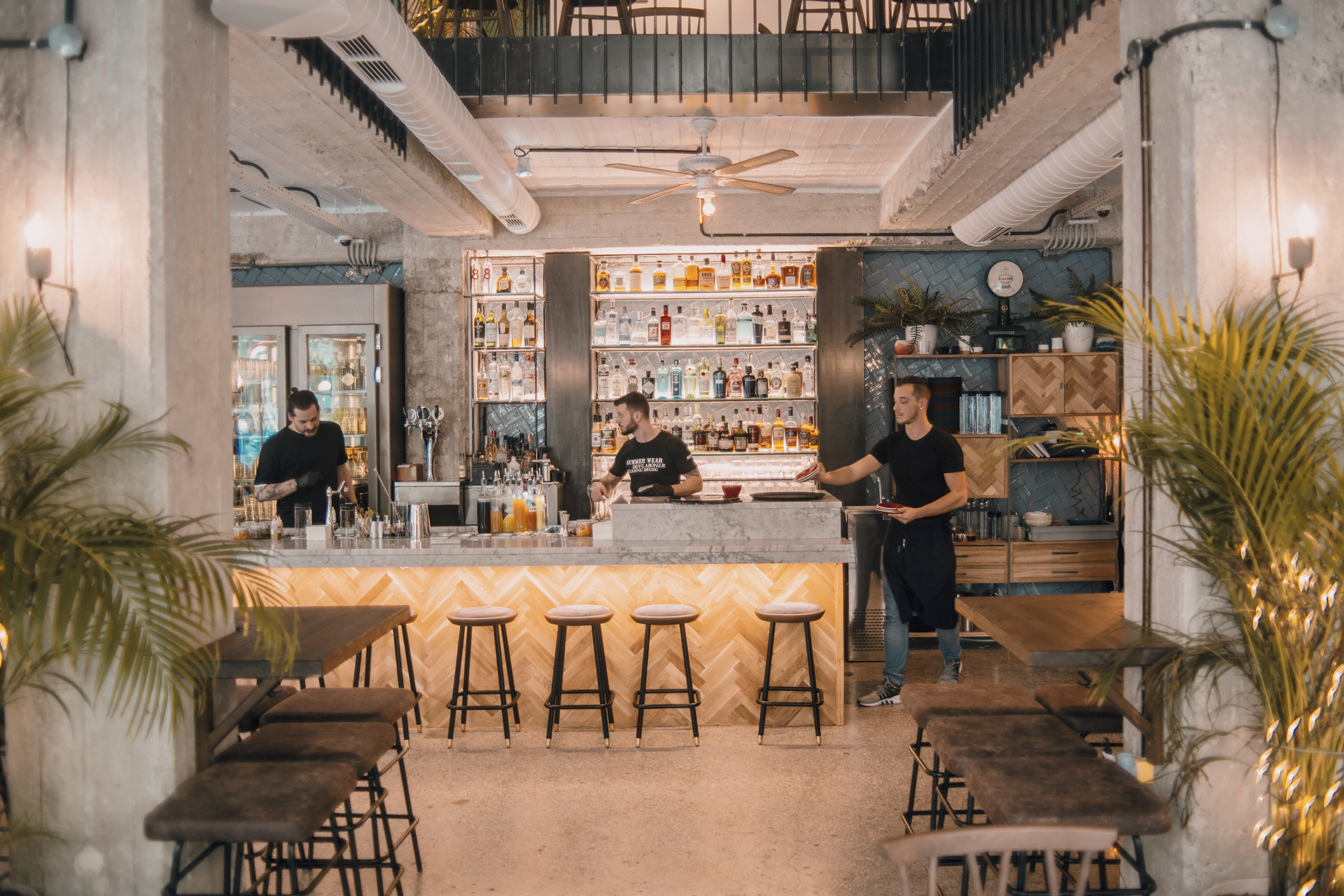 Η κουζίνα στο ισόγειο που ετοιμάζεται το brunch. Όλα βρίσκονται σε κοινή θέα ώστε να μην αποξενώνεται ο πελάτης από τον τρόπο προετοιμασίας του φαγητού.