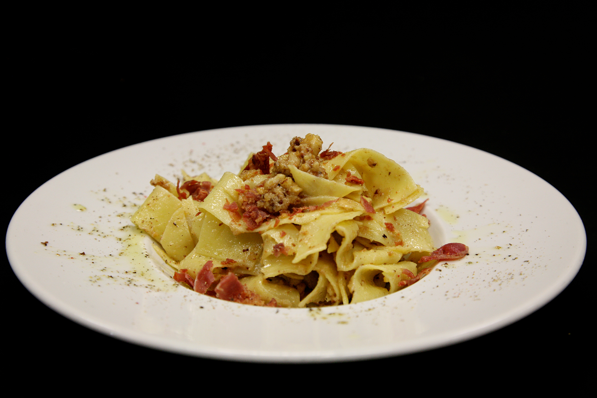 Βράζουμε σε μπόλικο αλατισμένο νερό τις παπαρδέλες μέχρι να γίνουν αλτέντε και παράλληλα κόβουμε με το μαχαίρι τα φουντούκια σε μικρότερα κομμάτια. Σε ένα τηγάνι σε μέτρια φωτιά ρίχνουμε 2 κουταλιές της σούπας ελαιόλαδο, λίγο αλάτι (λίγο γιατί θα είναι αλμυρό και το προσούτο). Ρίχνουμε μέσα τα φουντούκια και τα καβουρδίζουμε μέχρι να πάρουν λίγο έξτρα χρώμα. Μόλις πάρουν χρώμα ρίχνουμε την κρέμα γάλακτος και αποσύρουμε απ τη φωτιά. Ρίχνουμε τα μακαρόνια από την κατσαρόλα μέσα στη σάλτσα μας και ανακατεύουμε με ένα κουτάλι έτσι ώστε να πάει η σάλτσα μας παντού.