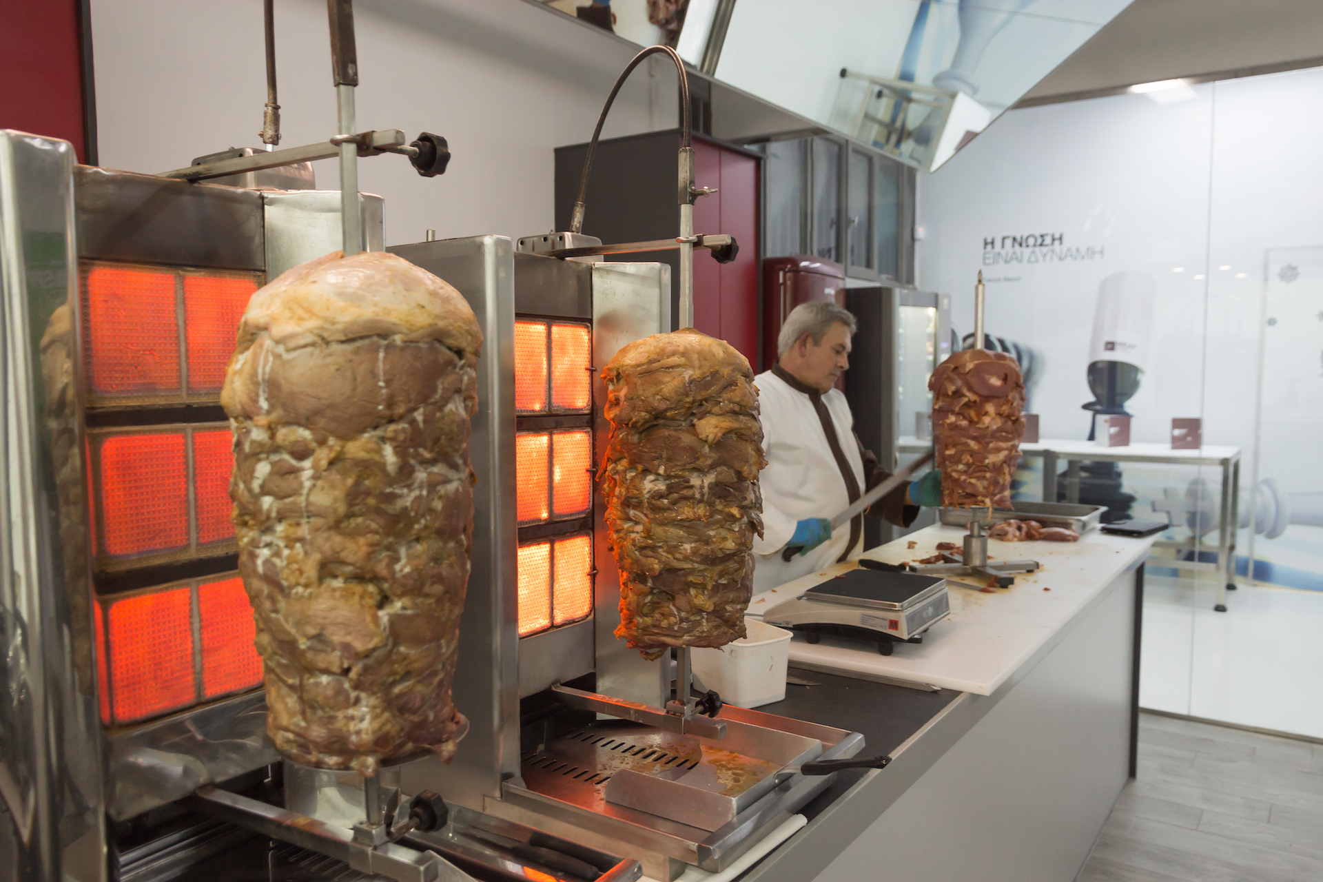 Το μάθημα περιλάμβανε κάθε στάδιο της παρασκευής του γύρου από την προετοιμασία της σούβλας και το αρχικό ξεκοκάλισμα των μεγάλων κομματιών μέχρι τις βασικές διαφορές που έχει το χοιρινό από το κοτόπουλο και το τελικό κόψιμο, το οποίο φυσικά έγινε όπως πρέπει με το χέρι και όχι με αυτά τα ηλεκτρικά μαραφέτια που είναι σαν λειαντές ξύλου. Ο κύριος Θοδωρής, με εμπειρία που ξεπερνά τα 30 χρόνια στον χώρο, βγήκε μπροστά κι έδειξε πως τα μεγάλα κομμάτια κρέατος αποκτούν το χαρακτηριστικό πλατύ και λεπτό σχήμα σαν σνίτσελ πριν περαστούν στη σούβλα σε μια διαδικασία που θυμίζει κόψιμο στα δύο -σαν να σκίζεται ένα βιβλίο – ενός στήθους κοτόπουλου για να ψηθεί στα κάρβουνα αλλά.