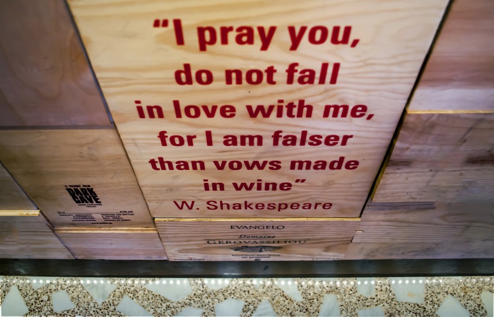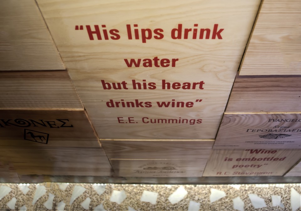 To Sideways προσφέρει μόνο κρασί και μπρουσκέτες, αλλαντικά, τυριά, σπιτικές πίτες και από καφέ μόνο εσπρέσο. Καθώς πίνω ένα ποτήρι Κτήμα Μουσών Χρυσόλιθος, ισορροπημένο blend Chardonnay και Μαλαγουζιάς, δοκιμάζω μια δροσερή μπρουσκέτα με πέστο φασκόμηλο, αγγούρι και δυόσμο και μια γευστικότατη θαλασσινή με γαύρο μαρινάτο και κρίταμο. Έρχεται κι ένα πλατό τυριών και αλλαντικών για συνοδεύσει άψογα το κρασί και τη κουβεντούλα. Αφού περνάω στο δεύτερο ποτήρι χαζεύω τους εγκλωβισμένους φελλούς στην μπάρα αλλά πιο πολύ τα λογοτεχνικά αποσπάσματα ή αποφθέγματα που σχετίζονται με το κρασί και κοσμούν επίσης την μπάρα. Μεταξύ άλλων διαβάζω “Wine enters through the mouth, love the eyes, I raise the glass to my mouth, I look at you I sigh” W.B. Yeats.