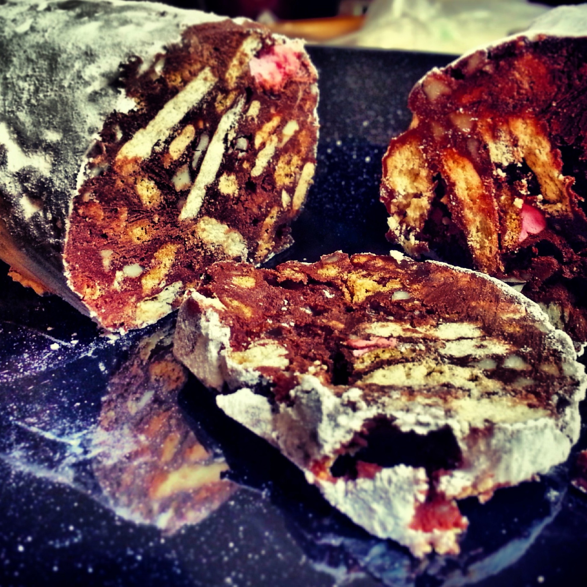 Η δική μου προσπάθεια για γλυκό σαλάμι θα μπορούσε να ονομαστεί “Sokolatenio Choriatiko Loukaniko”