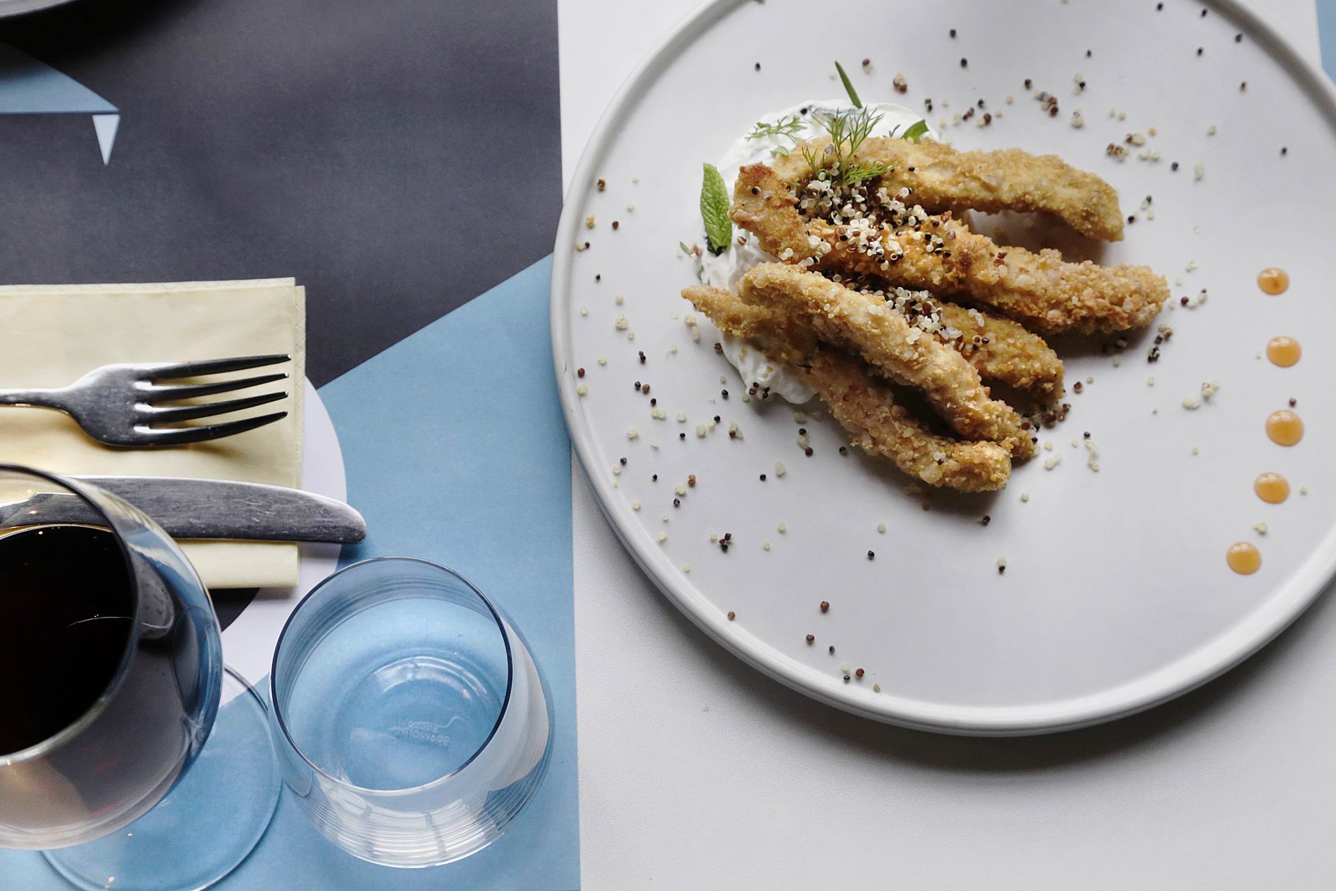 Σαλάτα λαχανικών, με αρσενικό Νάξου, αχλάδι, κρουτόν παστελιού και vinaigrette με μηλόξυδο.