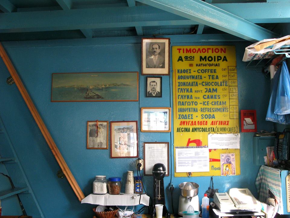 Νωρίς το πρωί εκεί, οι ψαράδες πίνουν τον πρώτο καφέ της ημέρας τους. Αργότερα, επαγγελματίες της πόλης μιλούν για την καθημερινότητα και διαβάζουν εφημερίδα, επισκέπτες του νησιού, συνταξιούχοι ναυτικοί αλλά και καπετάνιοι, που λένε ο ένας στον άλλο ιστορίες από τα μακρινά τους ταξίδια στην Ιαπωνία, την Αφρική και τη Βραζιλία, για τα δώρα που έφερναν στις γυναίκες τους, όταν επέστρεφαν στο σπίτι. Διηγούνται βέβαια και άλλες, πιο πικάντικες περιπέτειες, με γυναίκες και τρικυμίες. Το όλο σκηνικό συμπληρώνεται από καραφάκια με ούζο και τσίπουρο, τα οποία συνοδεύονται πάντα με ένα απλό, κλασικό μεζεδάκι (λίγο τυρί, ντομάτα, ψωμί και παστό ψάρι).