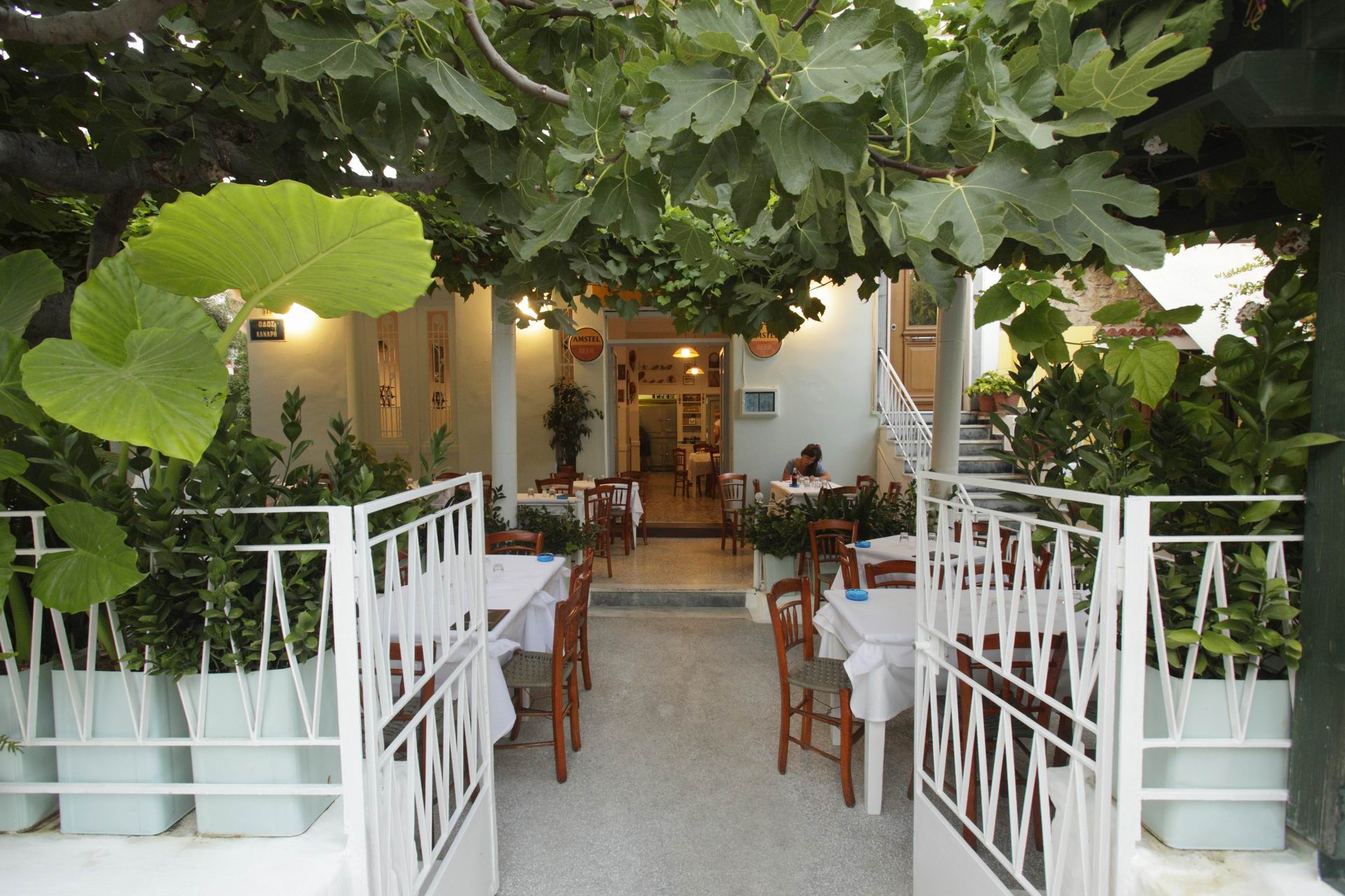 Η ασβεστωμένη αυλή με τη συκιά που βγαζει βασιλικά και το πυκνό άγριο κλήμα μοιάζει να είναι τοποθετημένη σε κάποιο γραφικό χωριό, είναι δροσερή, εντυπωσιακά φροντισμένη, αξιοζήλευτη.