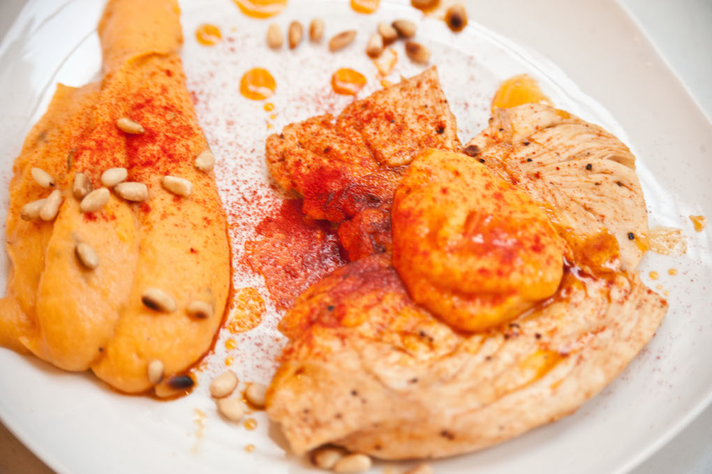 «Bolets del dia» (μανιτάρια σωτέ με πικάδα, δηλαδή μείγμα ψωμιού με ξηρούς καρπούς και αρωματισμένο λάδι); Λουκάνικό από αγριογούρουνο a la catalana με πατάτες φούρνου και κόκκινες πιπεριές ή μήπως τη φημισμένη Brandada; Ε, τελικά υποκύπτουμε στη τρίτη επιλογή. Κι έρχεται ένα καυτό, λευκό αινιγματικό πιάτο για να αποκαλυφθεί μια αφρώδης, αλλά μεστή στη γεύση κρέμα μπακαλιάρου που αφήνει ελαφρά σκορδάτη επίγευση στον ουρανίσκο. Πιάτα με ασυνήθιστα κρέατα (βουβάλι, αγριογούρουνο και μαυρόνυχο γουρούνι), μανιτάρια (αδυναμία των Καταλανών), μπακαλιάρος βέβαια, τυριά και αλλαντικά που εισάγονται από την Ισπανία και φρέσκα λαχανικά αποτελούν το οπλοστάσιο της κουζίνας που λειτουργεί με δύο Έλληνες και δύο Καταλανούς. «Τα πιάτα μας είναι εμπνευσμένα από τους καταλανούς σεφ Σάντι Σανταμαρία, Τζάουμε Φάμπρεγα και τη συνεργάτιδα μας Λόλα Πουτζ» εξηγεί ο Βαγγέλης που όταν τον ρωτάμε ποιά πιάτα αναπολεί από τον τόπο της νέας του πατρίδας αναφέρει: «δεν τα θυμάμαι όλα με ακρίβεια, ξεχωρίζω όμως τ’ άγρια μανιτάρια που έχω φάει στο Ουλότ, τα κρέατα σχάρας στη La Llesca στη Gracia, το κοτόπουλο στα ξύλα στο El Romani στο Pals της Costa Brava , στον Cal Pep στο Born και πολλά, πολλά άλλα. Α, και βέβαια αξέχαστη είναι και η ανσαϊμάδα που τρώω στον Pons στη Μανόρκα!»
