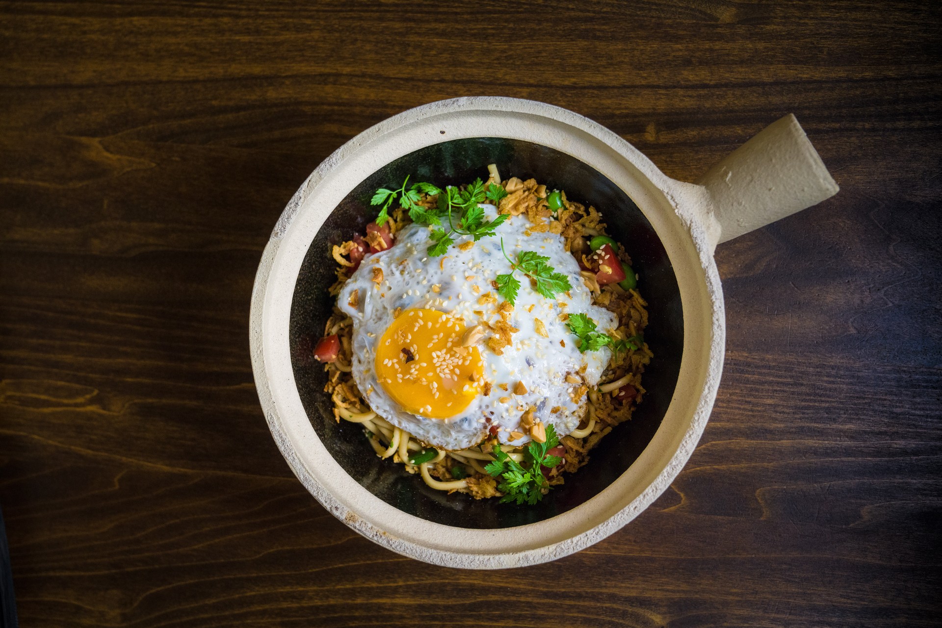 Breakfast udon bowl με αυγό μάτι, κινέζικα μανιτάρια, ντομάτα, φασόλια edamame, φρέσκο κρεμμυδάκι, τραγανό κρεμμύδι, φιστίκια, φρέσκο κόλιανδρο, καβουρδισμένο σουσάμι και λεμονάτη sauce σόγιας