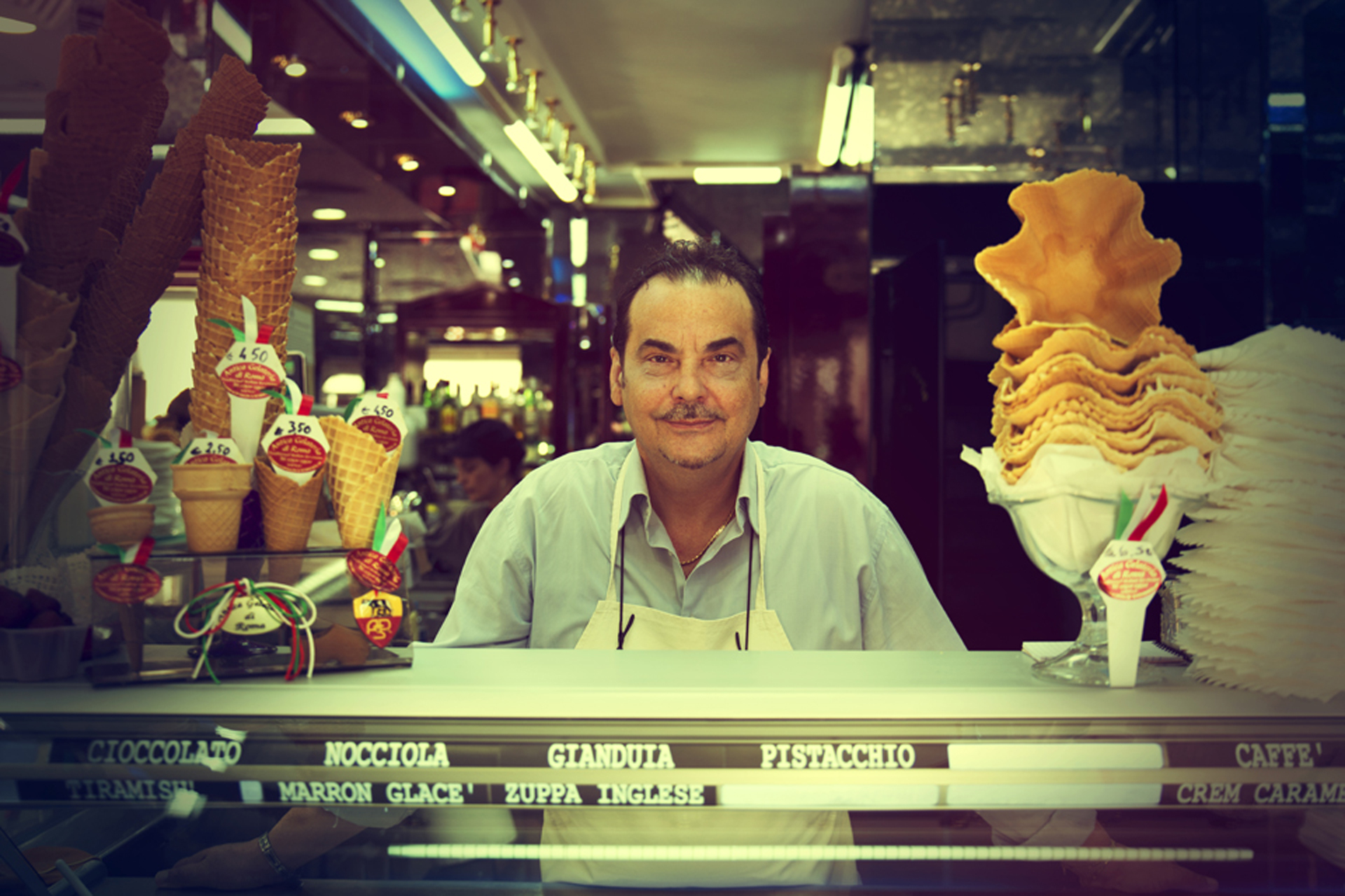 Στην Ιταλία, όλα τα παγωτά φτιάχνονται μες στη gelateria, από το Α ως το Ω. Γι’ αυτό και παλιότερα απασχολούσαν πολύ προσωπικό: άλλος αναλάμβανε να ψωνίσει τα φρούτα, άλλος να τα καθαρίσει, άλλος να ψήσει τα χωνάκια. Αυτή τη πολιτική κρατήσαμε και εμείς στο μαγαζί. Όλα φτιάχνονται εδώ, ακόμη και τα χωνάκια και η σαντιγί