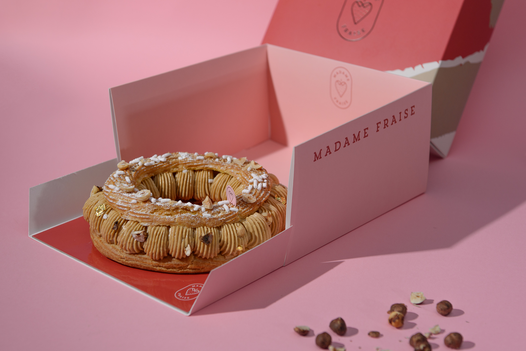 Μια Paris-Brest με κρέμα φουντουκιού και τραγανή πραλίνα, μια σφαίρα σοκολάτας με καραμέλα και φυστίκια που θυμίζει χριστουγεννιάτικο στολίδι, μια mont blanc με κάστανο και βανίλια και ένα διαφορετικό cheesecake φτιαγμένο με μους τριαντάφυλλο, μαρμελάδα βατόμουρο και σαμπλέ αμυγδάλου, μπαίνουν στο ροζ κουτί του Madame Fraise, για όσους θέλουν να γευτούν παραπάνω από ένα γλυκά από αυτά που φτιάχνουν ο Ευγένιος με τον Γιάννη. Από κει κι έπειτα, σε μέγεθος τούρτας μπορείτε να βρείτε την Amande, μία τούρτα με biscuit αμυγδάλου, bavaroise αρωματισμένη με τόνκα, μαρέγκα αμυγδάλου και αχλάδι confit, το μιλφέιγ με την βανίλια και την πραλίνα πεκάν, αλλά και την Gianduja Marron, με τη μους κάστανο, τη τζιαντούγια και τα αρώματα yuzu. Σε μορφή τούρτας βγαίνει επίσης η Paris Brest, αλλά και το cheesecake τριαντάφυλλο, το οποίο είναι έτσι φτιαγμένο ώστε να ενώνει και τις δύο εκδοχές του, αυτή του ψημένου, αλλά και αυτή με την μους. Όλα αυτά μπορείτε να τα απολαύσετε είτε παραγγέλνοντάς τα, είτε ακόμα καλύτερα πηγαίνοντας να τα παραλάβετε οι ίδιοι από το εργαστήριό τους στο Παγκράτι.