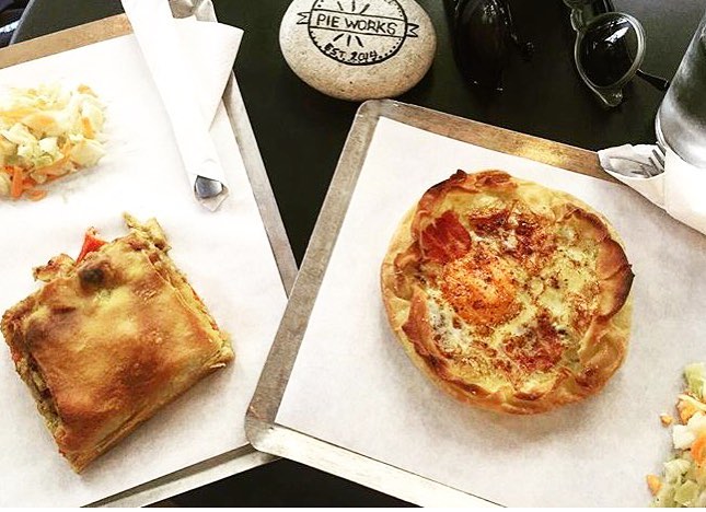Στο Pie Works θα δοκιμάσετε πρωτότυπες συνταγές όπως την Breakfast Pie με πουρέ πατάτας, τραγανό bacon και αβγό μάτι, πίτα με κοτόπουλο και κάρυ, πίτα με χοιρινό, μέλι και μουστάρδα, πίτα με ολόφρεσκα μανιτάρια και θυμάρι και πολλές άλλες γεύσεις όπως πίτα με σπανάκι και μυρωδικά, πίτα με πράσο και τυριά, πίτα με κιμά τομάτα και φέτα, πίτα με τρία τυριά κ.α.
