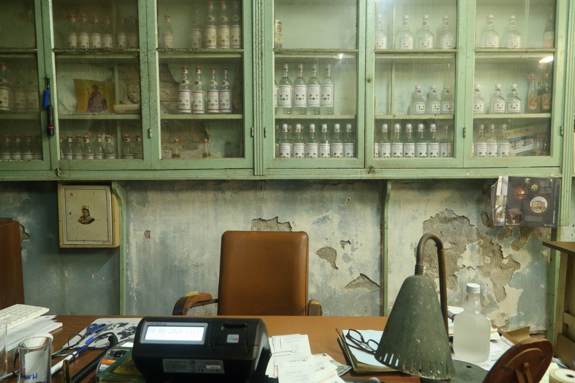 Παλιά βαρέλια και προθήκες που θυμίζουν μιαν άλλη εποχή βρίσκονται περιμετρικά στους τοίχους του μαγαζιού. Όταν κάποιος μπαίνει μέσα, η μυρωδιά του ούζου διαπερνά τις αισθήσεις του, ενώ κοιτάζοντας το παλιό ξύλινο ρολόι στον τοίχο, φαίνεται σαν οι δείκτες του να τρέχουν προς τα πίσω και τότε ο χρόνος μετατρέπεται για λίγο σε μια τρυφερή αναπόληση της ζωής της πόλης σε ξεθωριασμένα χρώματα γαλάζια.
