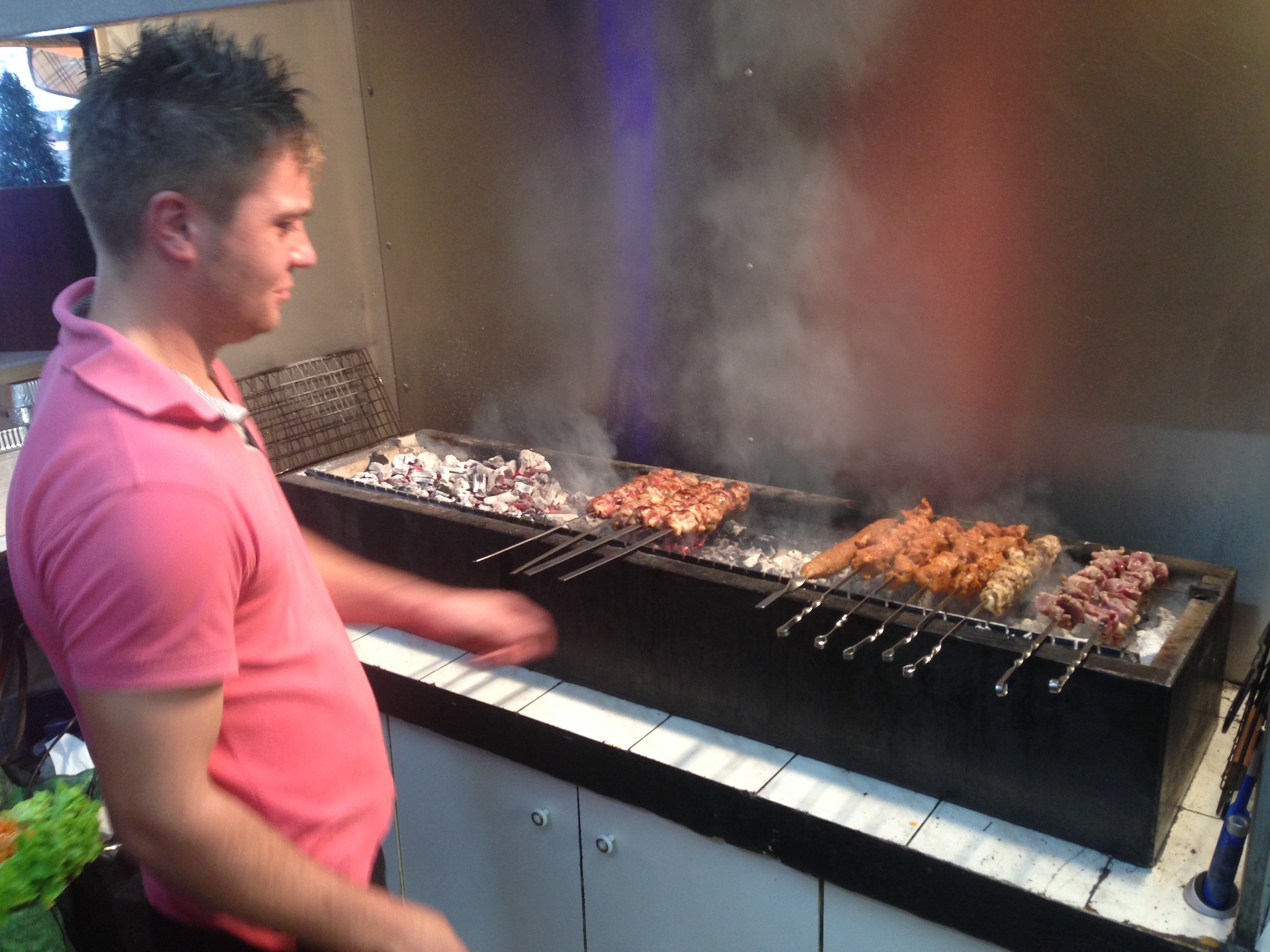 Στον τοίχο του διπλανού νεκροταφείου (Α’ κοιμητήριο Δήμου Αχαρνών) κάποιος έχει γράψει το σύνθημα “Original και στον παράδεισο”. Απέναντι ένα τεράστιο σουβλατζίδικο της αλυσίδας του Σάββα έχει κλείσει προ πολλού και κείτεται σαν άδειο κουφάρι. Στην πυλωτή ενός διώροφου κτιρίου έχει δημιουργηθεί ένας χώρος με καλάμια περιμετρικά. Δύο ψυγεία με μπύρες (και παραδόξως όχι βότκες), μερικά τραπεζάκια και στο βάθος ένα Korg synthesizer με ένα μικρόφωνο δίπλα. Ο μέσα χώρος είναι μικροσκοπικός. Η ψησταριά, ένα πάσο και ένα μίνι χριστουγεννιάτικο δέντρο. Οι “Κουμπάροι” άνοιξαν πριν από ένα χρόνο από δυο κουμπάρους από το Καζακστάν. Μενού δεν υπάρχει. Μια πανύψηλη ξανθιά με καυτό σορτσάκι (γυναίκα του ενός κουμπάρου) έρχεται στο τραπέζι και σου αραδιάζει τις επιλογές από σασλίκ (το “ρώσικο σουβλάκι” που είναι κρέας μαριναρισμένο και περασμένο σε μεταλλική βέργα), ενώ από τα ηχεία παίζει ένα medley με τις μεγάλες επιτυχίες του Πασχάλη Τερζή. Οι επιλογές «παίζουν» ανάμεσα σε αρνί , συκώτι, χοιρινό, κοτόπουλο ή κεμπάπ. Αρχικά έρχεται το ζεστό καψαλισμένο ψωμί -πίτα το οποίο ονομάζεται λεπιόσκα που σου σερβίρουν σε καλαθένια ψωμιέρα και μια καταπληκτική ρώσικη σπιτική σαλάτα με αρακά, τουρσί, μαγιονέζα, και μικρά κομμάτια από τυρί και ζαμπόν. Συνοδευτικό μια υπέροχη ρώσικη καροτοσαλάτα, καθώς και μια «Χε», μια ιδιότυπη πικάντικη παρασκευή από ψιλοκομμένα στομαχάκια κοτόπουλου, πιπεριές, ξύδι και καρυκεύματα. Κορυφαίο ήταν το χοιρινό σασλίκ που αναπαυόταν αχνίζοντας σε μια σάλτσα ξυδιού και σε λεπτές φέτες κρεμμυδιού πασπαλισμένες με πάπρικα και το ζουμερό και ιδανικά πικάντικο κεμπάπ (από τα πιο ωραία που έχω δοκιμάσει στην Αθήνα). Δίπλα κατέφθασε και ένα μικρό μπολάκι με τη σάλτσα τσατσιπέλ μια ψιλοκαυτερή σάλτσα με πιπεριές, σκόρδο και ντομάτα που ήταν ότι έπρεπε για “βούτες” στο κρέας. Δίπλα μας μια παρέα εργατών που μόλις είχαν τελειώσει το μεροκάματο έπιναν μπύρες μιλώντας φωναχτά, ενώ ο Άλεξ ο γιος της ξανθιά κυρίας έδινε show κάνοντας πασαρέλα πάνω σε πέντε πλαστικά σκαμπό που είχε φροντίσει να βάλει στον διάδρομο που οδηγεί από το δρόμο στο εσωτερικό του μαγαζιού.