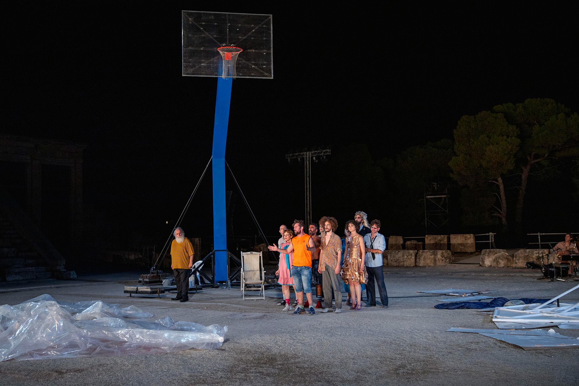 Βράδυ Σαββάτου στην Επίδαυρο, σκαρφαλώνοντας προς το θέατρο εν μέσω καύσωνα, στη σκηνή μας περίμενε μια υπερμεγέθης μπασκέτα και άσπρες…
