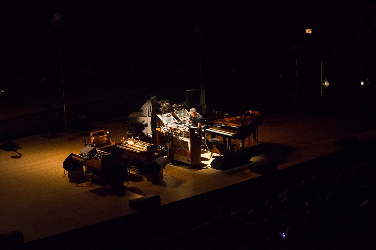 Τρία αρμόνια σε σχήμα πι μεταξύ τους, μερικά ακόμα synths πλάτη σε αυτά, κουμπιά, καλώδια κι ένα πιάνο με ουρά.…