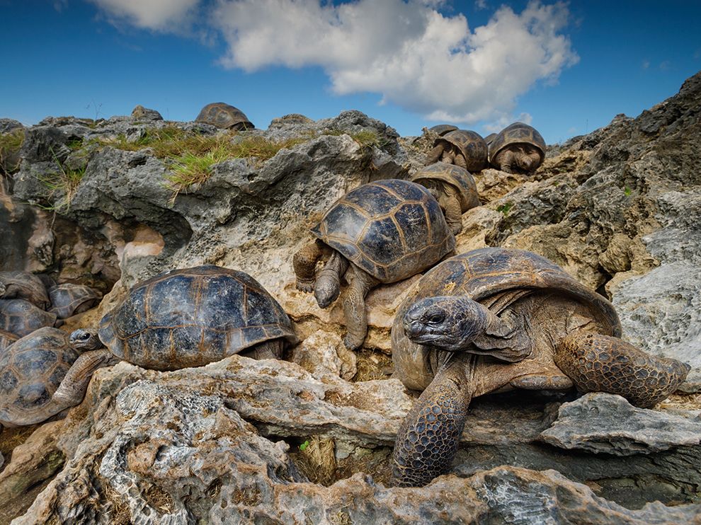 Η παραπάνω φωτογραφία, που ανήκει στον φωτογράφο Τόμας Πέσακ, απαθανατίζει γιγάντιες χελώνες της Αλντάμπρα να απολαμβάνουν τον ήλιο που λούει το κοραλλιογενές νησί…
