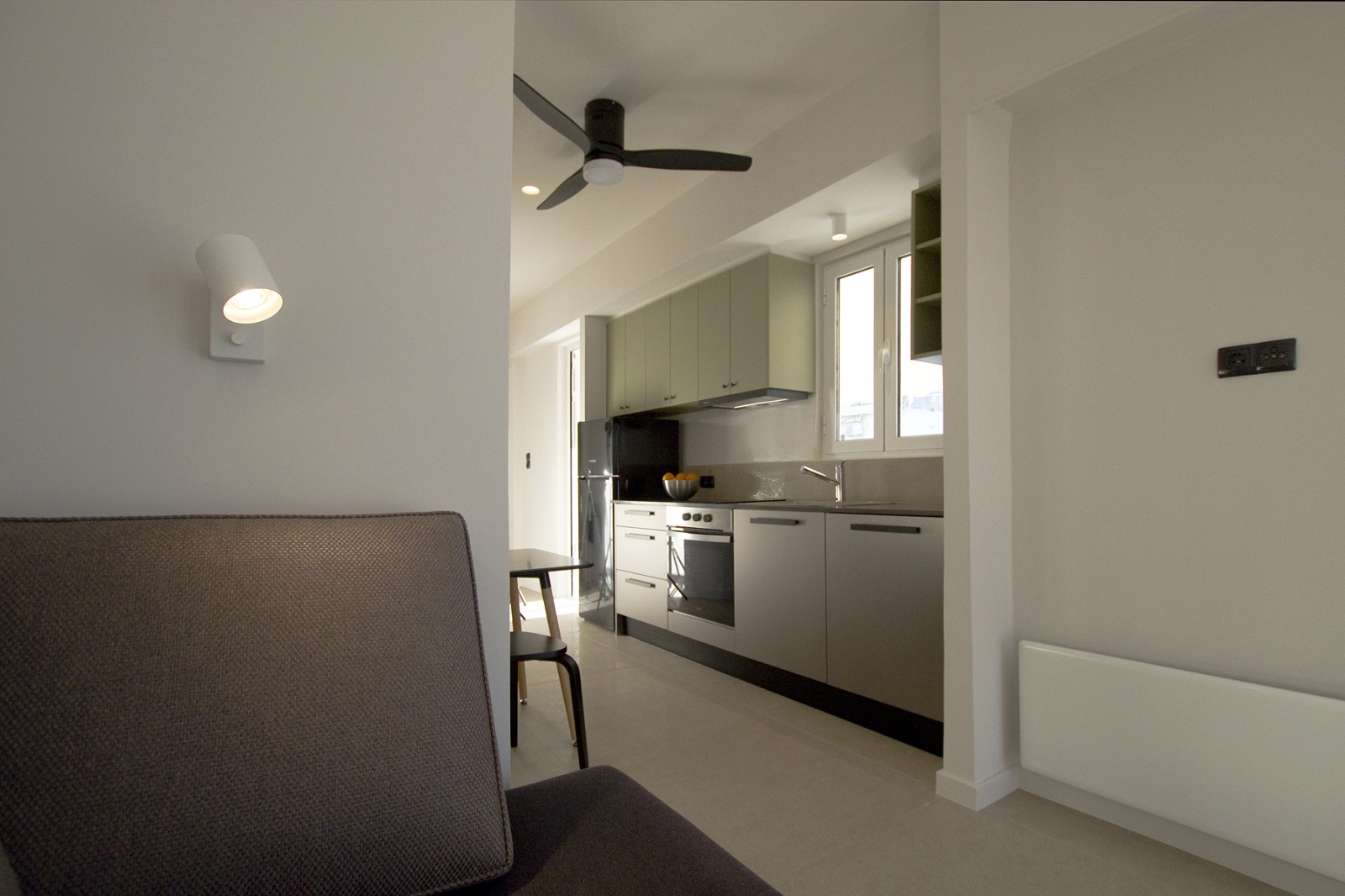 Με εργαλεία έναν καμπύλο λευκό τοίχο, σαν αγκαλιά, μια μπλε κουρτίνα ως κινητό όριο, μια γραμμική κόκκινη κουζίνα στον ρόλο…